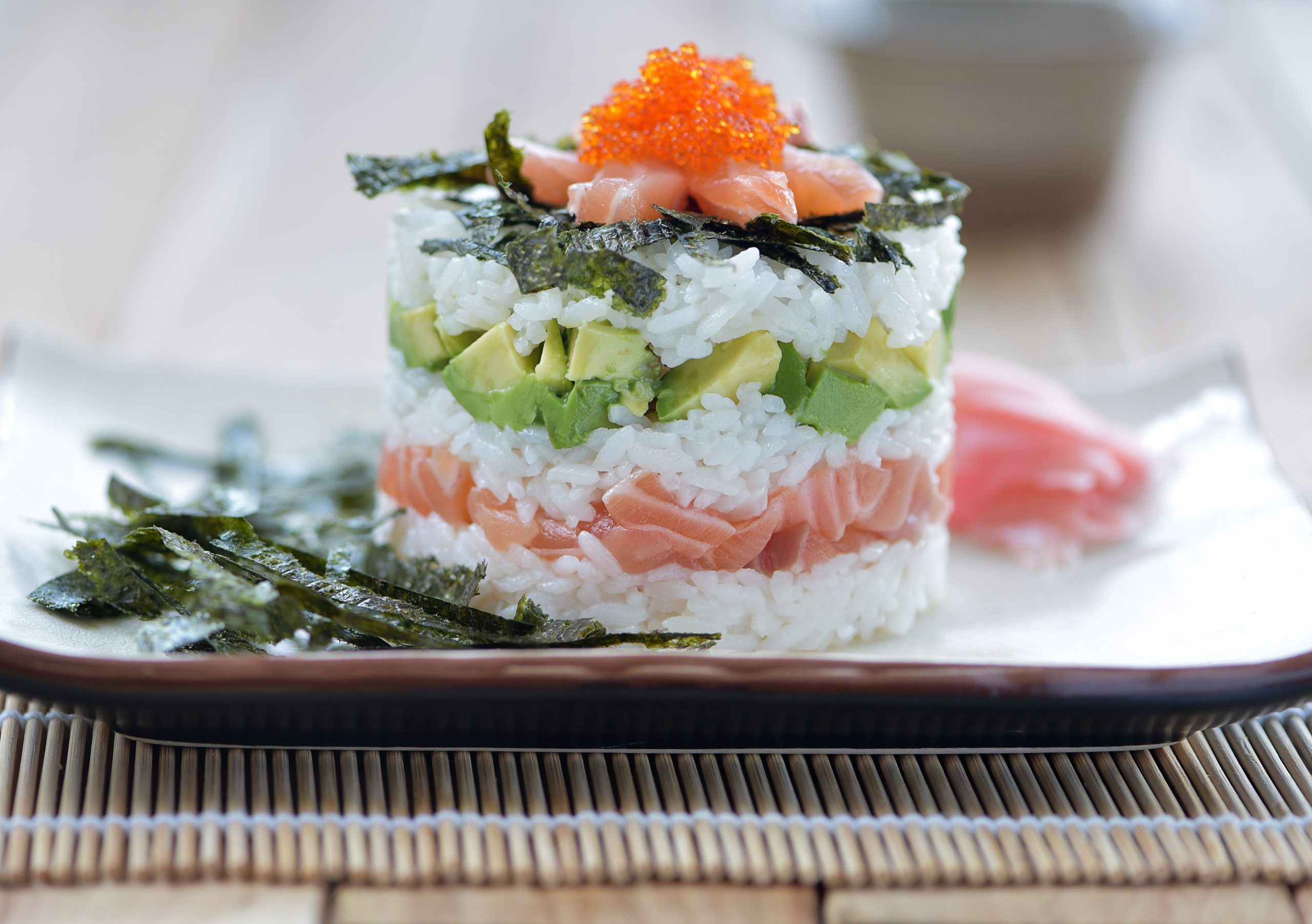 5) På med sista riset, toppa sedan med några nori ”blad”, lax och tångkaviar på toppen.