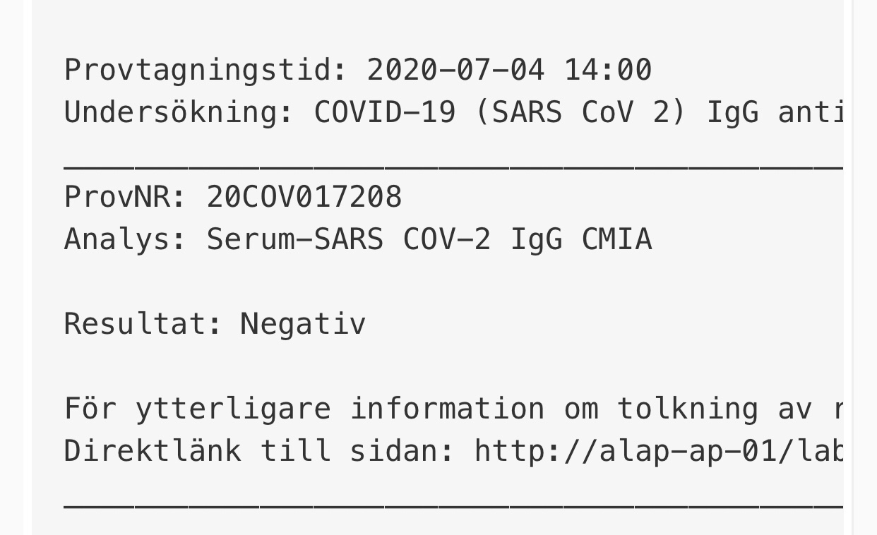 Idag kom svaret på antikroppstestet och som jag redan trodde var det negativt för både mig och Tony. Vet inte vad man ska känna, hade ju varit skönt om man var en av de där som inte blivit sjuk och ändå fått antikroppar, eller att det där i mars när jag var superrisig var det där förbaskade viruset. Men men, då vet vi att vi ska fortsätta att vara försiktiga. Så var det med!