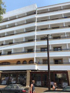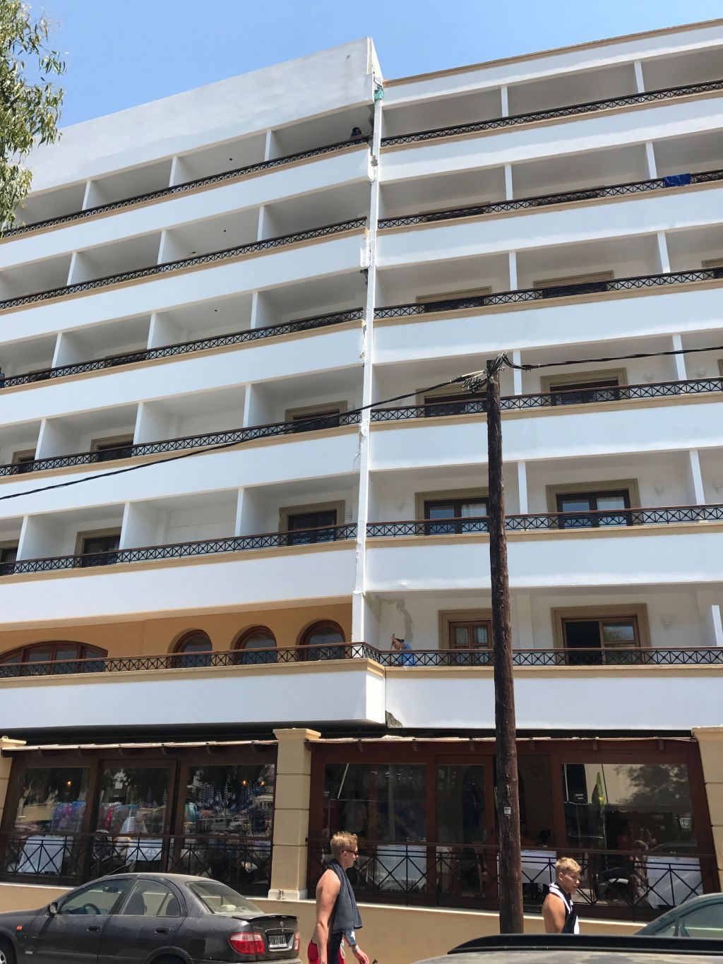 Här är deras hotell som det såg ut efter skalvet. Balkongerna har liksom lossnat.