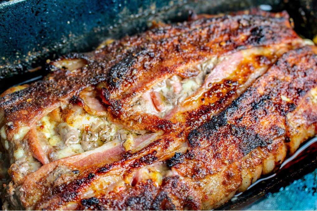 3) Krydda sista tredjedelen över baconen. Skjuts in i ugnen på 200 grader i 30 min. Skär sedan upp i bitar till servering.