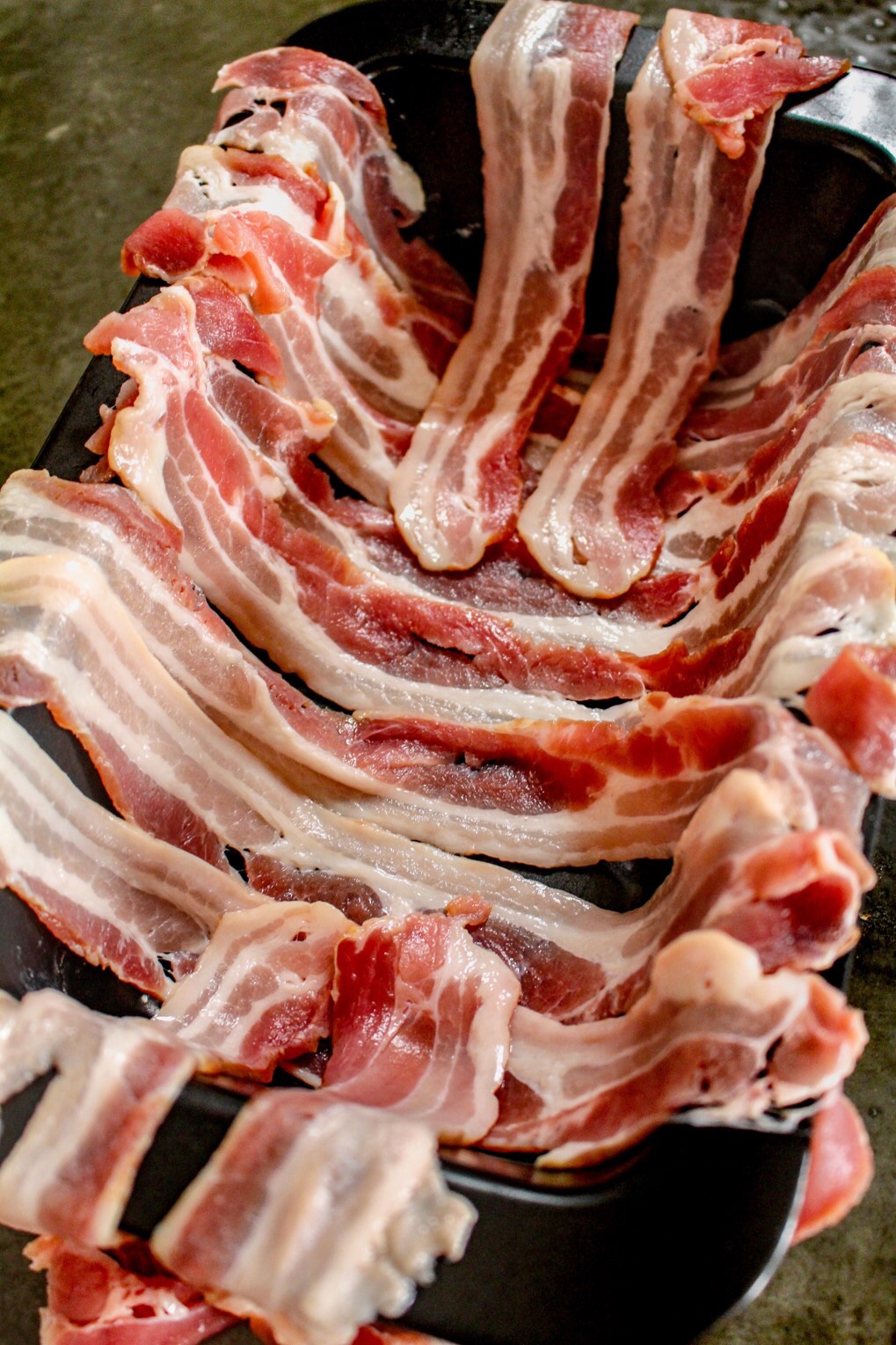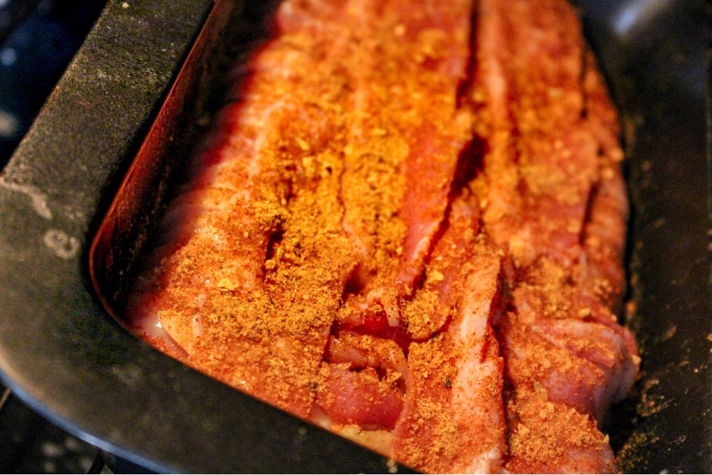 1) Lägg bacon i en ugnsfast form. På bilden ovan ser du hur jag gjorde. Krydda 1/3 av påsen på baconen.
