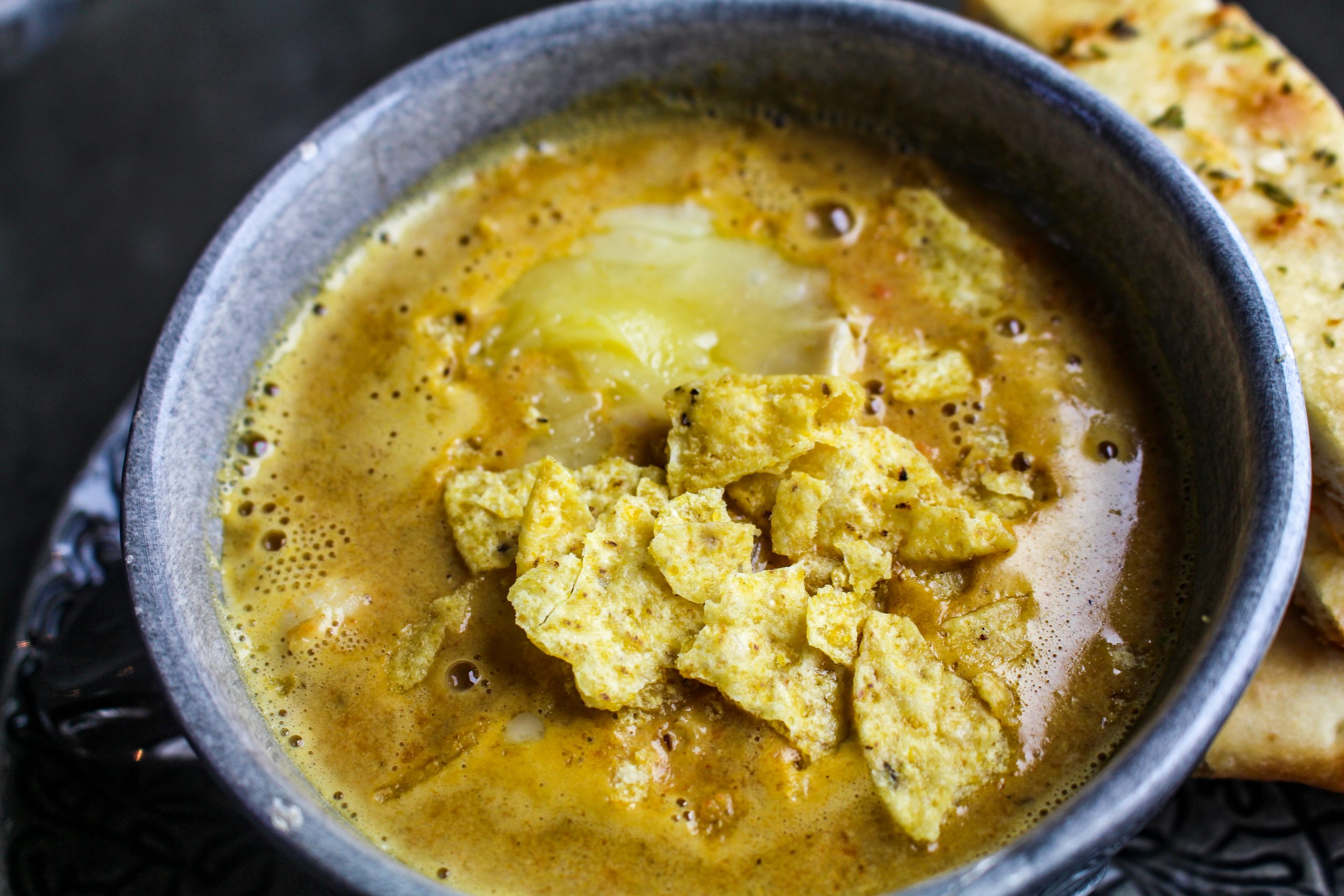 3) Ta av från värmen och mixa soppan så den blir helt slät, jag använde en handmixer. Häll upp i skålar, toppa med kycklingen som du rivit i små bitar, hackade nachoschips och riven ost. Låt osten smälta ned i soppan, gör den inte det kan du ställa in den i micron en liten stund. Avnjut med något gott bröd, t ex mina vitlöks-flatbread.