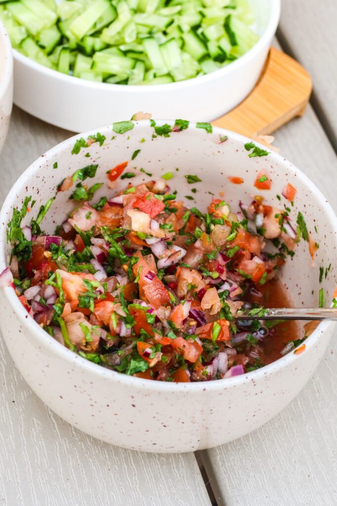 2. Pico de Gallo: Hacka lök, tomater och koriander så smått du kan. Jag kör med min Lökhackare (<klicka) och den är helt klart bäst! Lägg i allt i en stor skål. Skålen (<klicka) är toppen, använder både som frukostskålar eller som här serveringsskålar. Salta, peppra och ha på citronsaften. Gott med lime också.