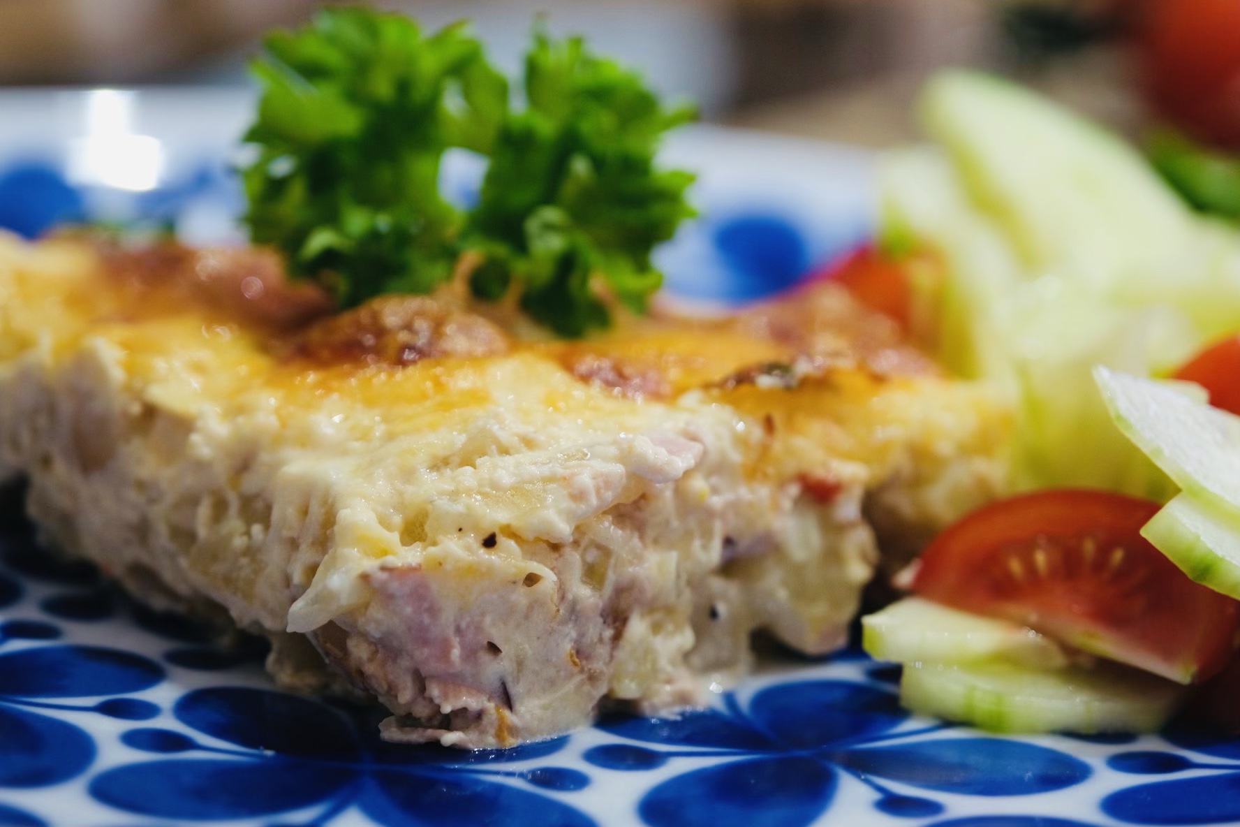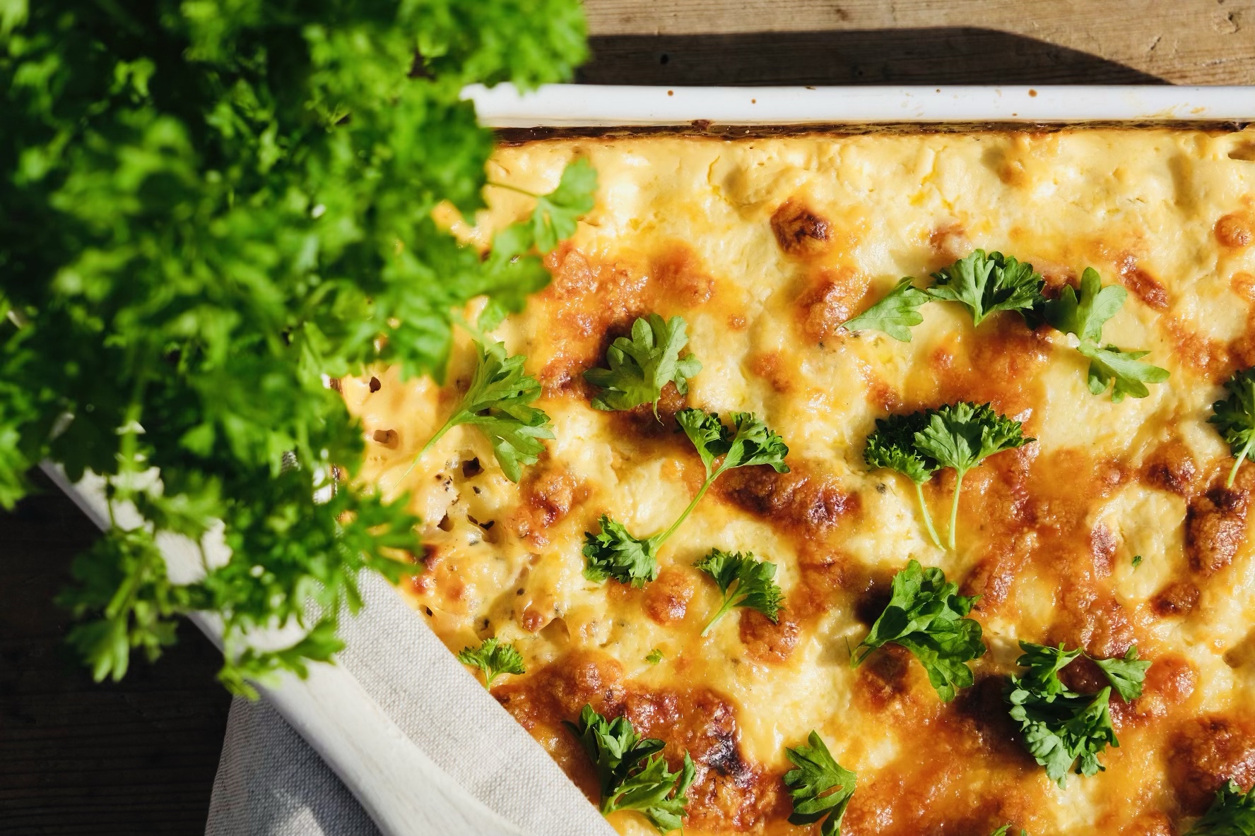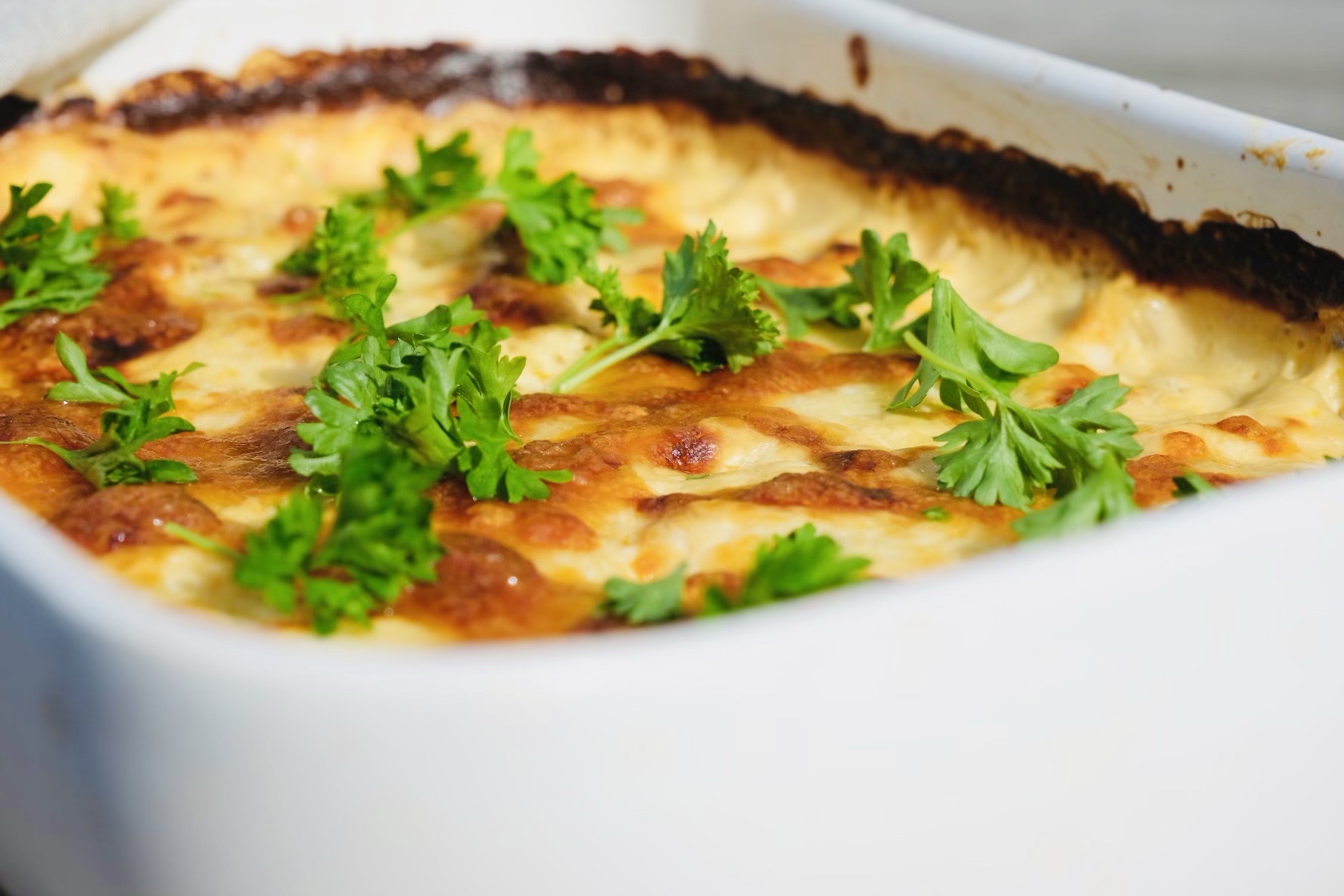4. Blanda Philadelphiaosten med grädden. Vispa runt så det blandas ordentligt. Häll allt över potatisblandningen. Skjuts in i mitten av ugnen i först och främst 40 min. Öppna sedan och ha på den rivna osten, låt stå i ca 20 min till tills osten fått fin färg. Toppa med hackad persilja och ät med grönsallad. Familjen tyckte det var supergott.