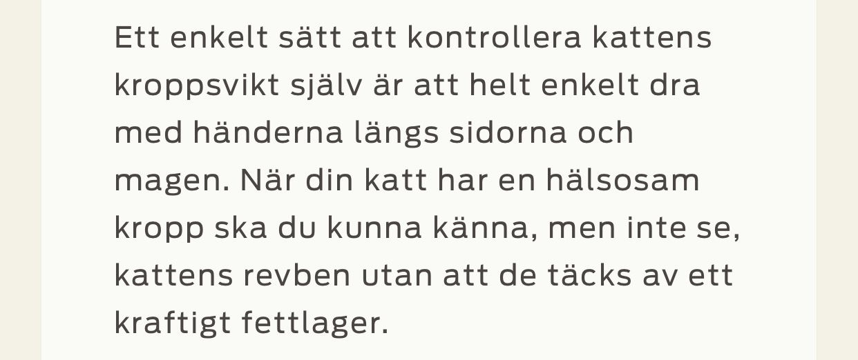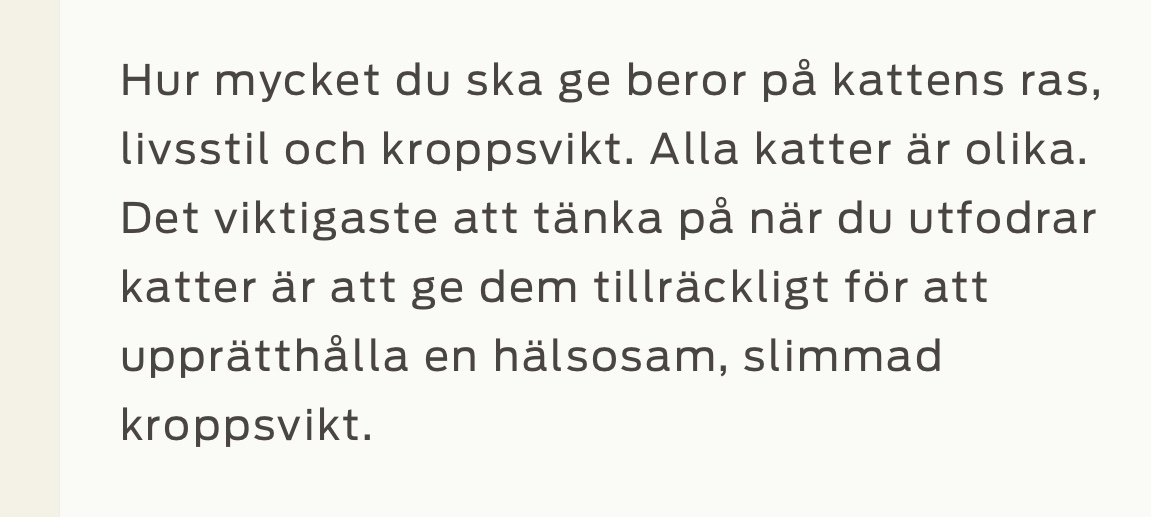 Ok, när jag läser det här så inser jag att Majlis nog är lite överviktig. Inte ett revben känns…. 🙈 Googlar vidare på hur mycket hon ska äta….. Tydligen inte mer än 40-70 gr torrfoder (som hon föredrar just nu). Hon får betydligt mer, ok… Läser vidare att man inte kan banta katter fort utan långsamt, det ska ta flera månader. Oj oj…. så hon ska jama mer efter mat än hon redan gör? 😫 Måste läsa på ordentligt.