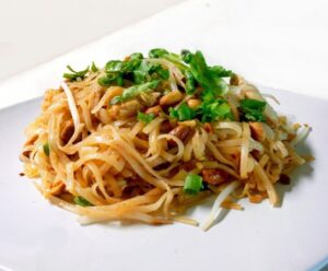 4) Servera med risnudlar, jordnötter och klipp över lite salladslök och färsk koriander.