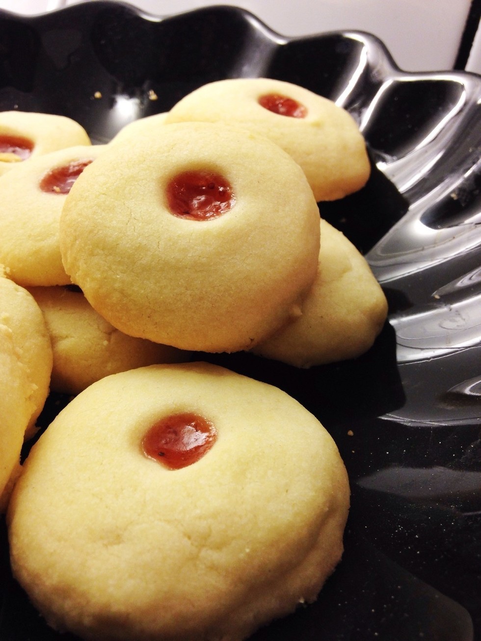 3) Tryck en liten grop i varje kaka som du fyller med sylt. Grädda i mitten av ugnen i ca 10 min.