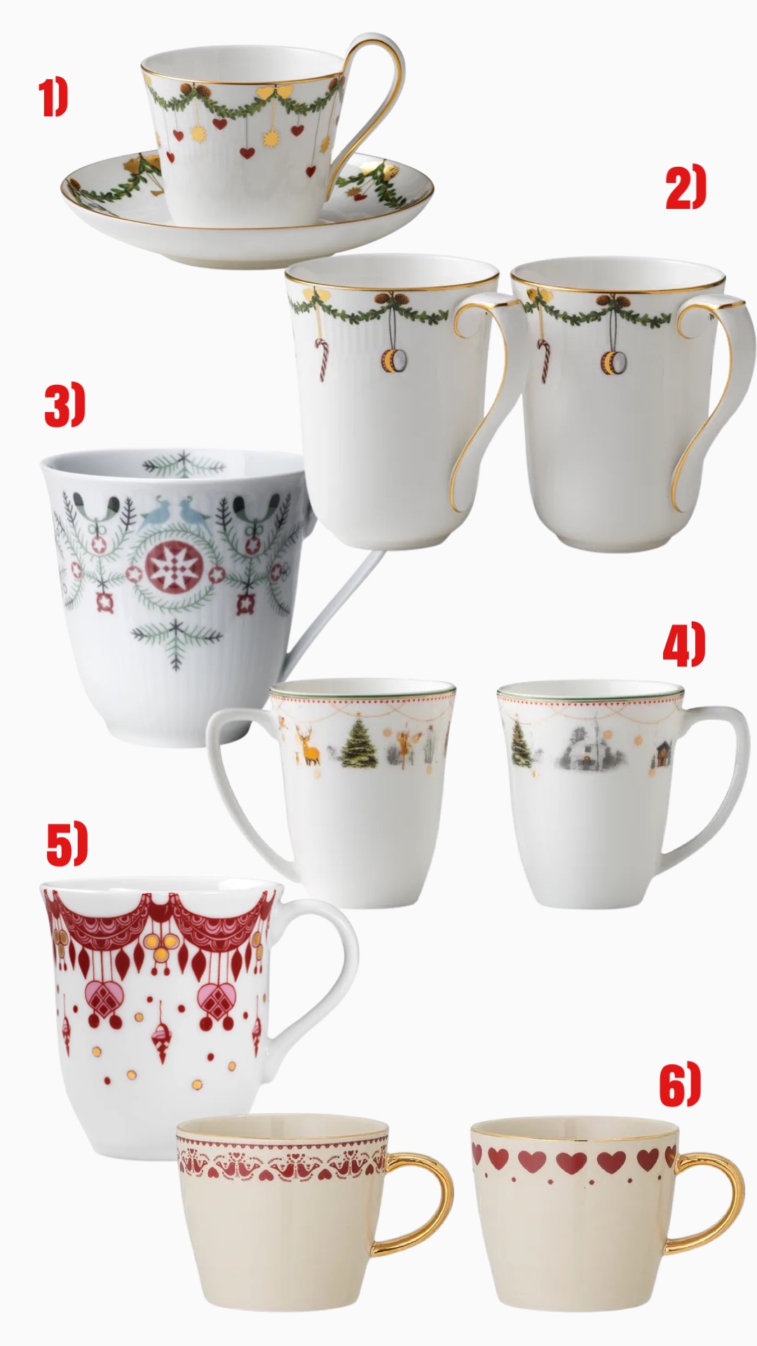 Apropå muggar, hur mysigt att dricka kaffet eller den varma chokladen ur sina fina julmuggar? Jag ser hur de kommande barnbarnen dricker choklad ur dessa och kommer för alltid minnas farmors fina julmuggar. Det är en sån typisk barndomsgrej som man alltid bär med sig. Såna här muggar går aldrig ur tiden, det är därför det är så härligt att samla på porslin.