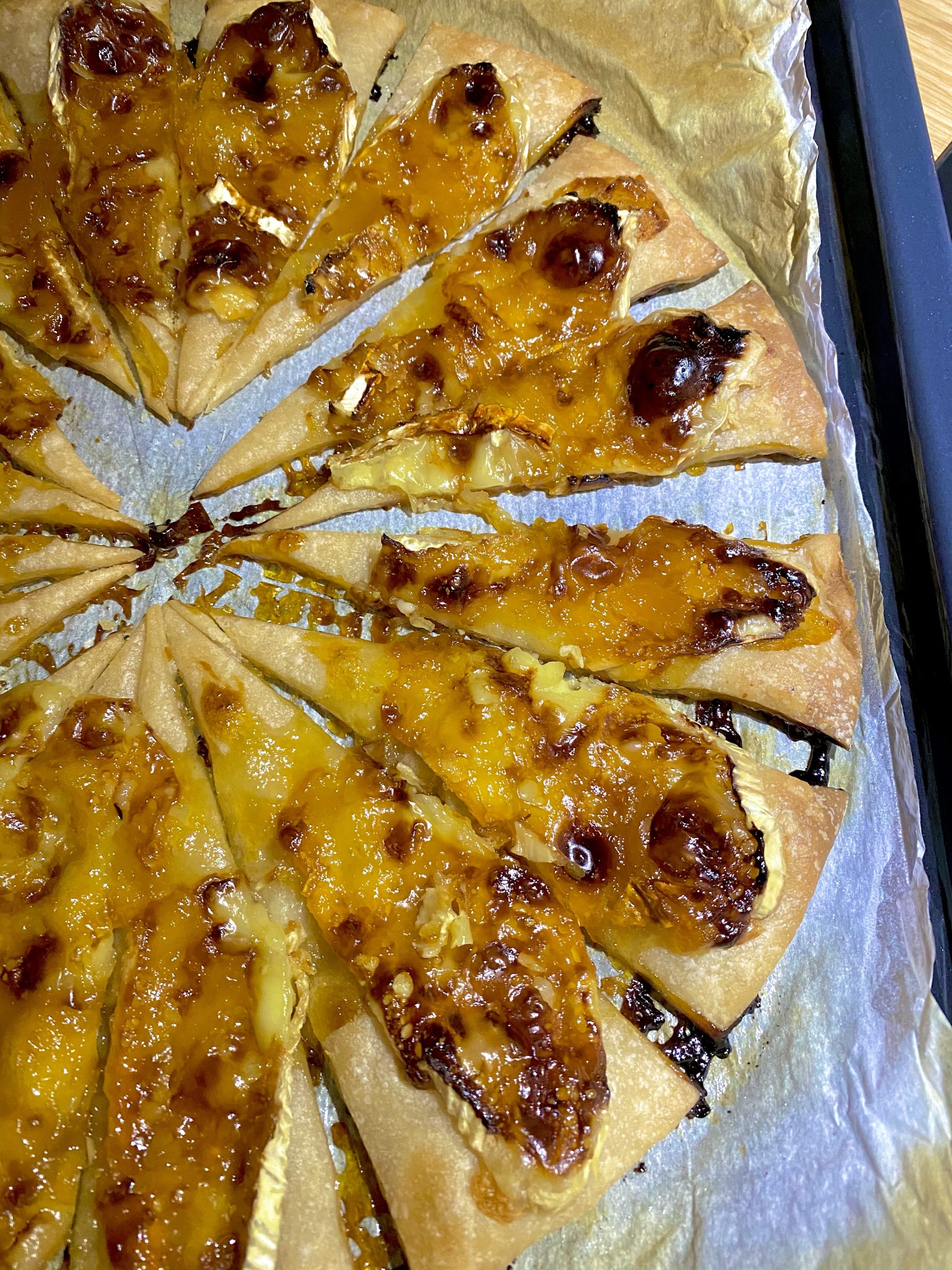 Som sagt, sedan körde jag med pizzaslizer och delade upp smördegsplattan som på bilden. Sen en Brieost som jag skar bitar ur och la på, efter det på med aprikosmarmelad och sedan in i ugnen på 200 grader i ca 20 min. Mot slutet täckte jag den med folie så inte osten skulle bli för mörk.