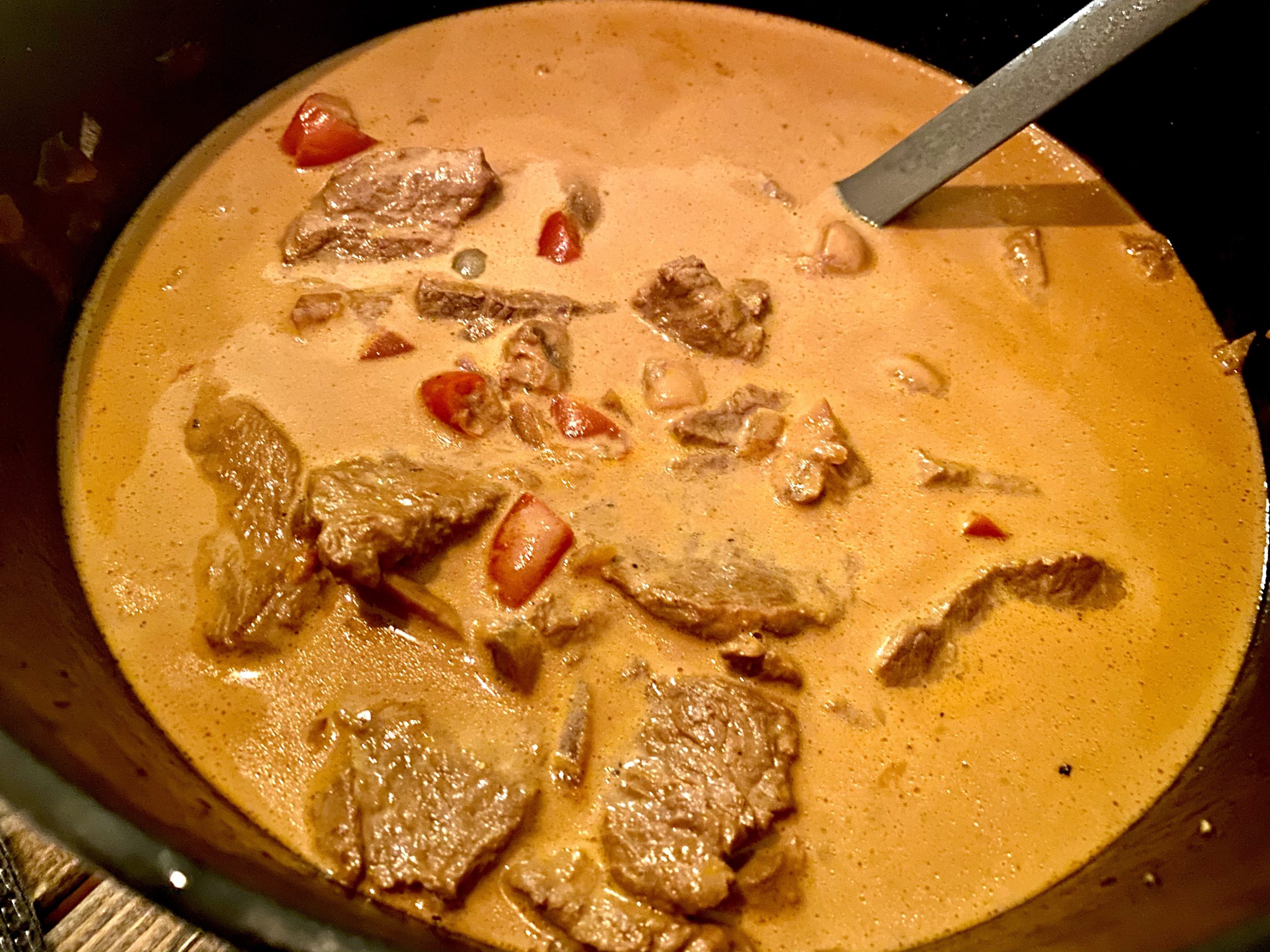 5) Stek sedan köttet på hög värme i ca 45 sek- 1 min på varje sida, ta av från värmen och lägg i en skål. När det är ca 3-4 min kvar på grytan att puttra lägger du i köttet och låter det puttra med. Smaka av med salt och peppar. Sedan är det klart! Vi åt det med ris och det var såååå gott.