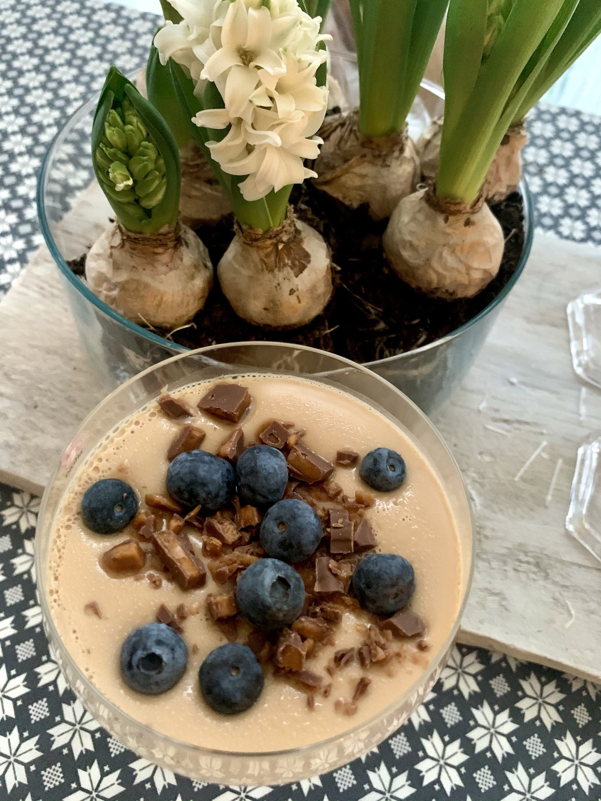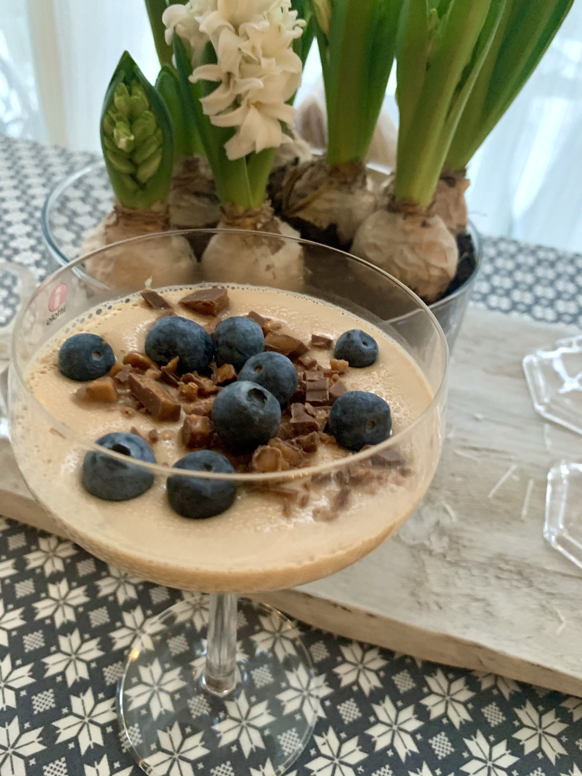 4) Häll upp i glas och ställ kallt i minst 4 timmar. Garnera med Daim och blåbär.