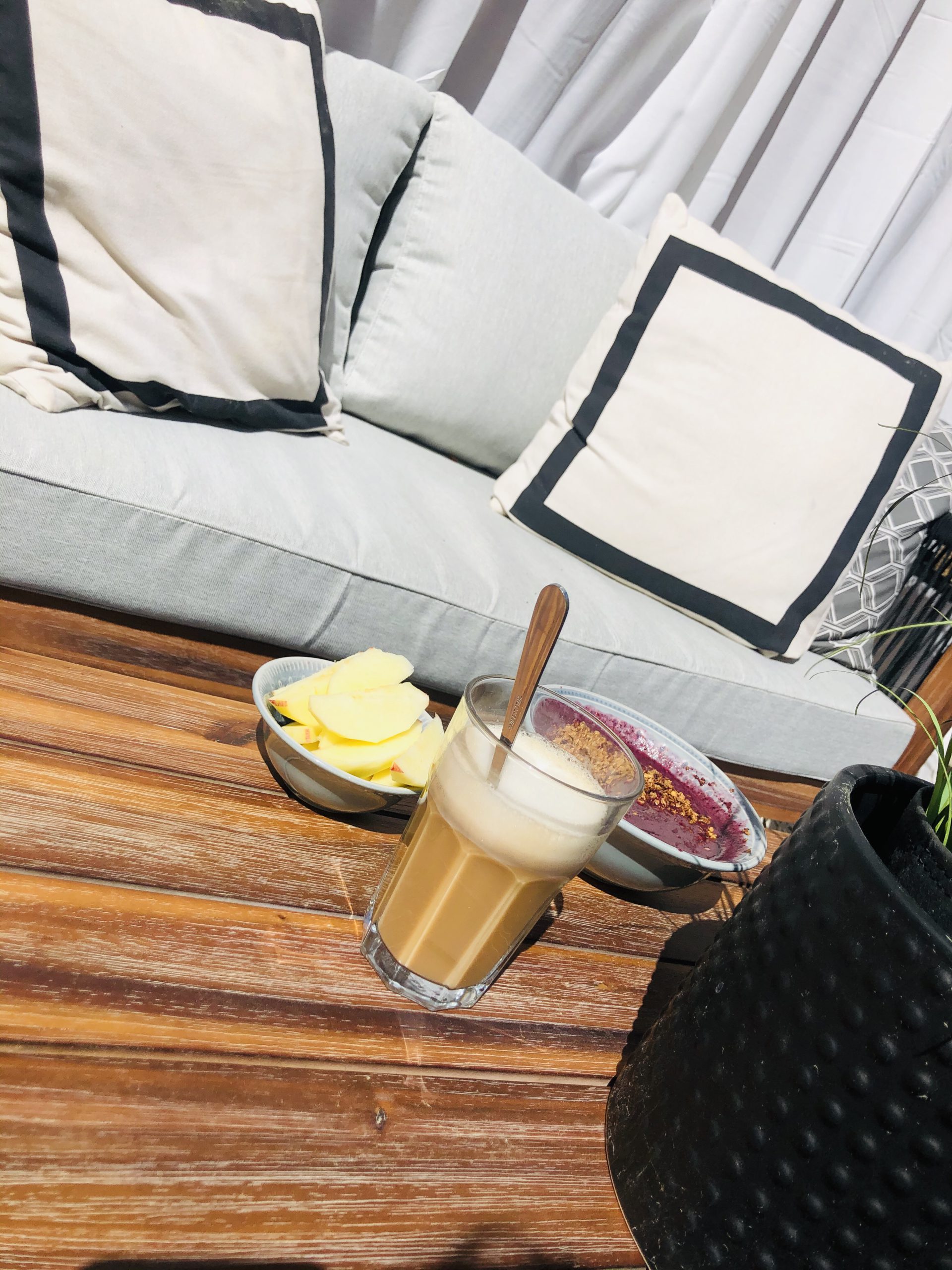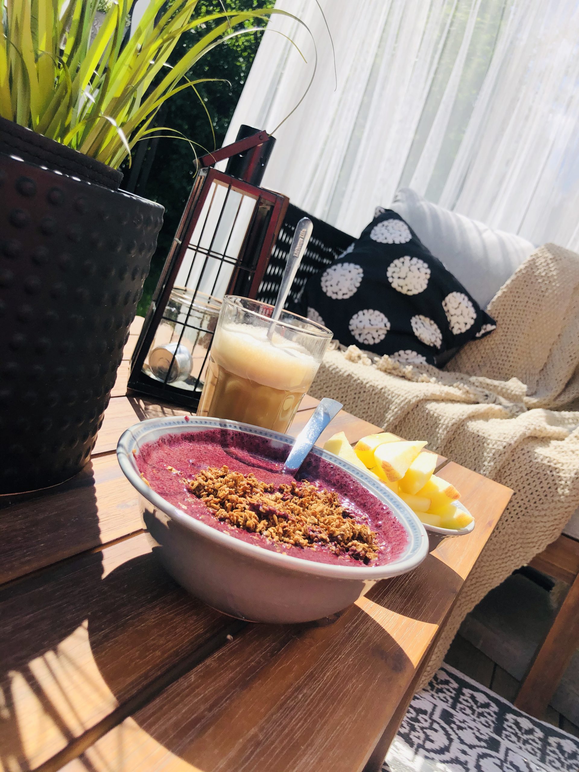 Här har ni mitt frukostmys. Nästan bara frukt och bär denna morgon. En smoothiebowl med hemmagjord granola och i själva smoothien är det 3 bananer och 1,5 dl blåbär och vatten. Ett skalat äpple och så kaffe med havremjölk. Mums!