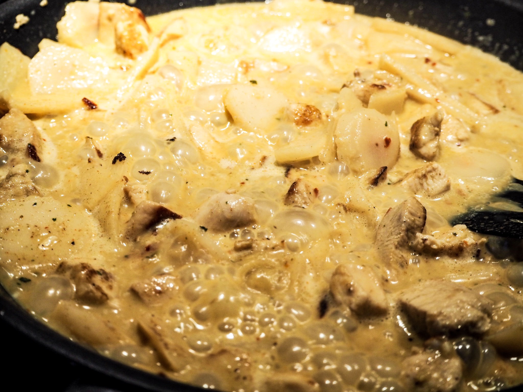 1) Skär kycklingen i mindre tärningar. Stek så de är genomstekta.