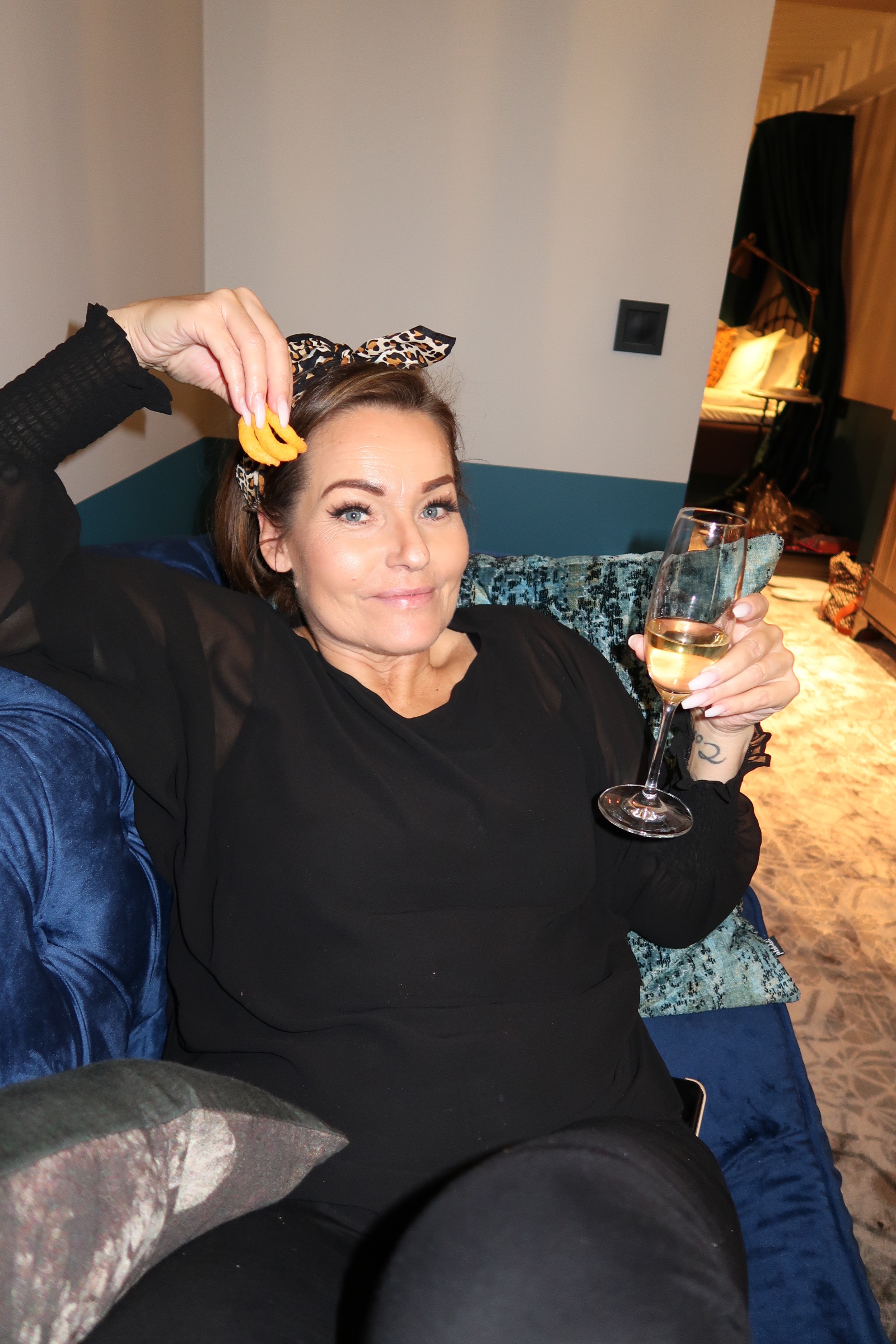 Vi fick ett par timmar att bara ligga i soffan och kolla TV och dricka lite bubbel och äta ostbågar. Jag var såååå nervös att han skulle höra när gästerna (som jag i hemlighet bjudit med) kom en efter en och checkade in i rummen bredvid oss. Men han anade ingenting alls.