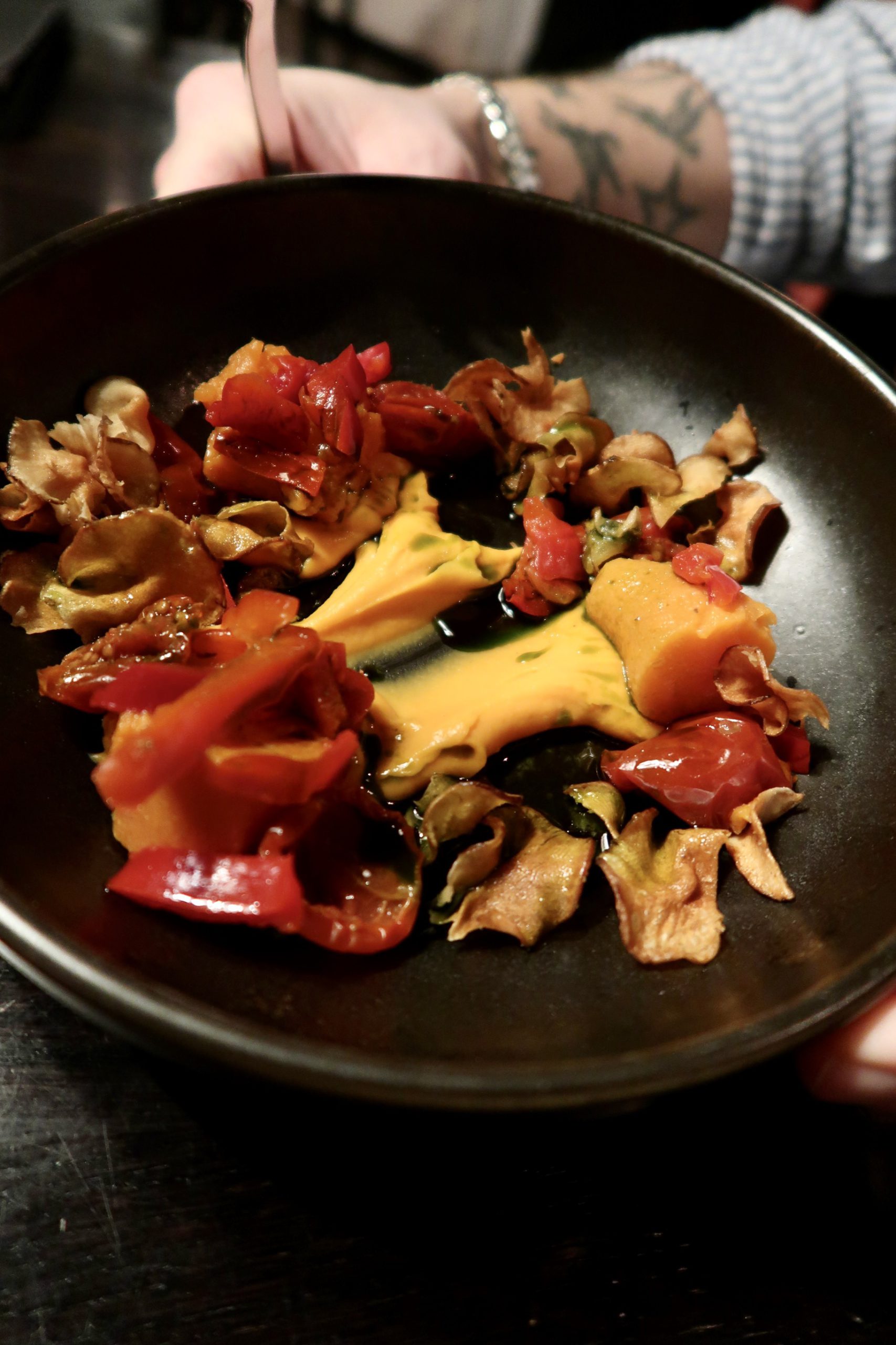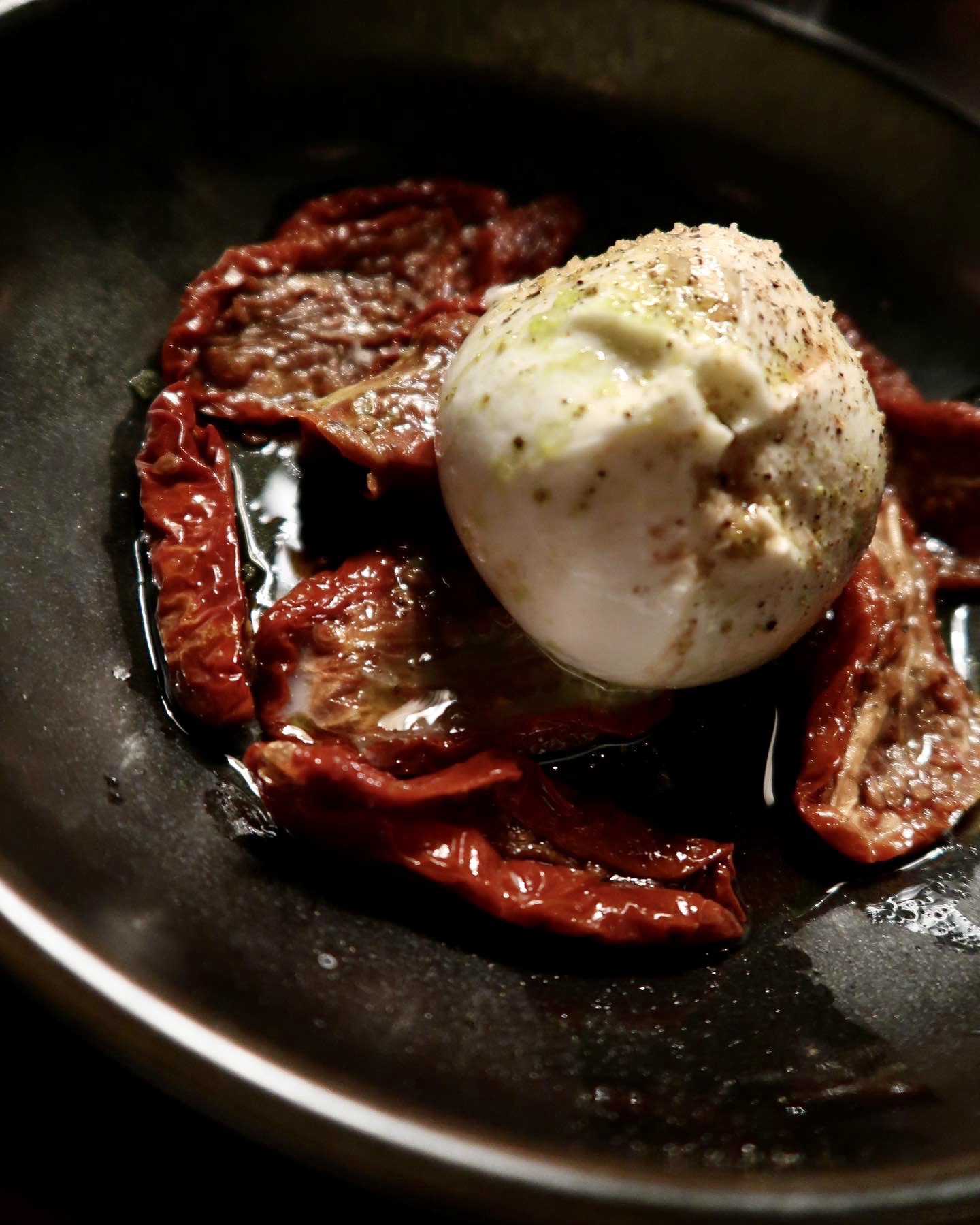 Förrätt blev burrata för mig och någon sötpotatistallrik till Tony. Milo tog spaghetti Bolognese som kom in till våra förrätter.