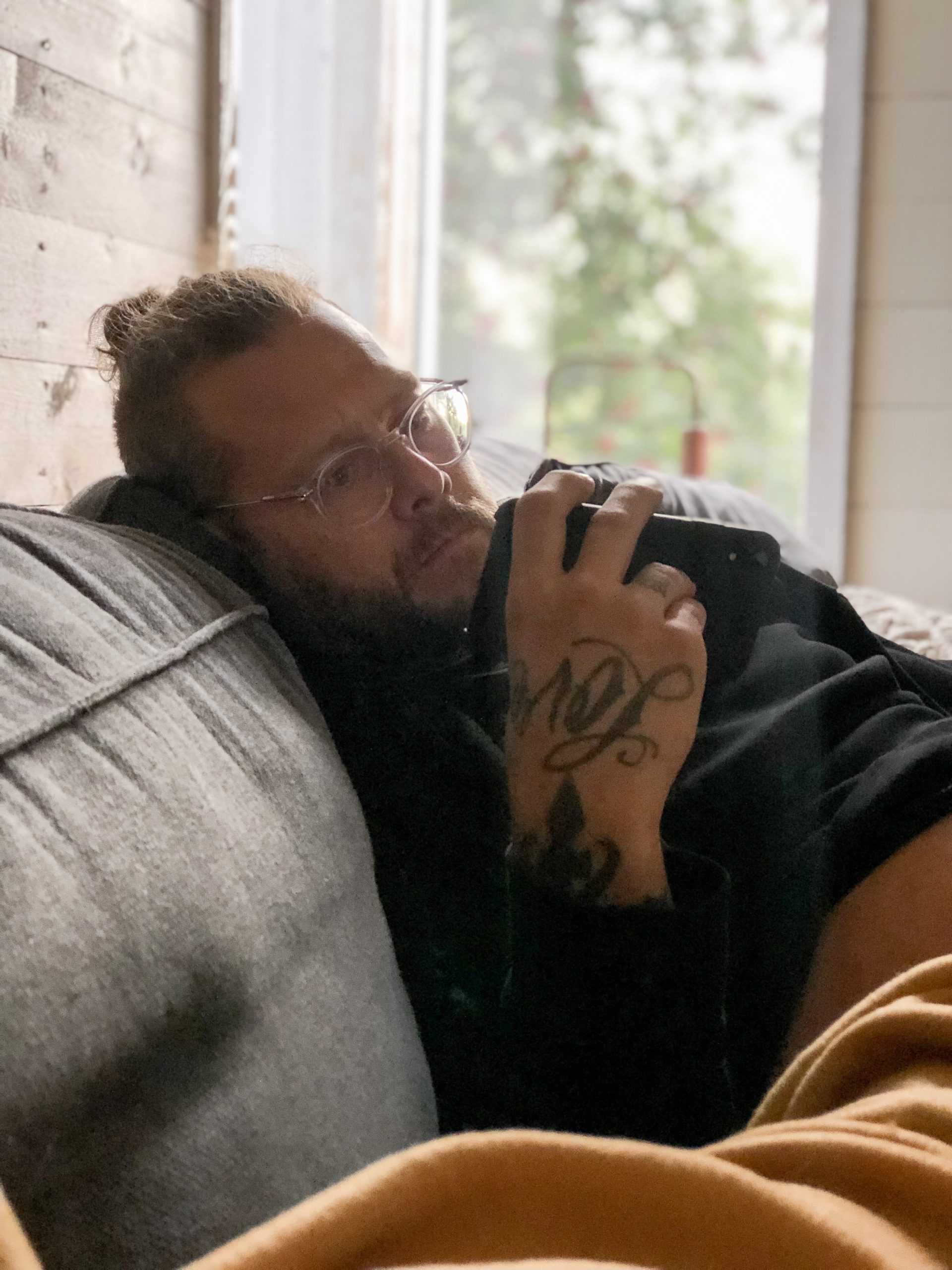 Han den här ”gubbsov” i soffan i ett par timmar när vi kom hem, med telefonen på magen. Han har någon spännande serie han följer. Vi har helt olika smak när det kommer till serier. Jag vill ha enkelt, lättsmält, glatt och härligt. Han vill ha svårt, spännande, allvarligt och lite mörkt. Helt tvärtemot mig. Bäst då att vi tittar på egna serier.