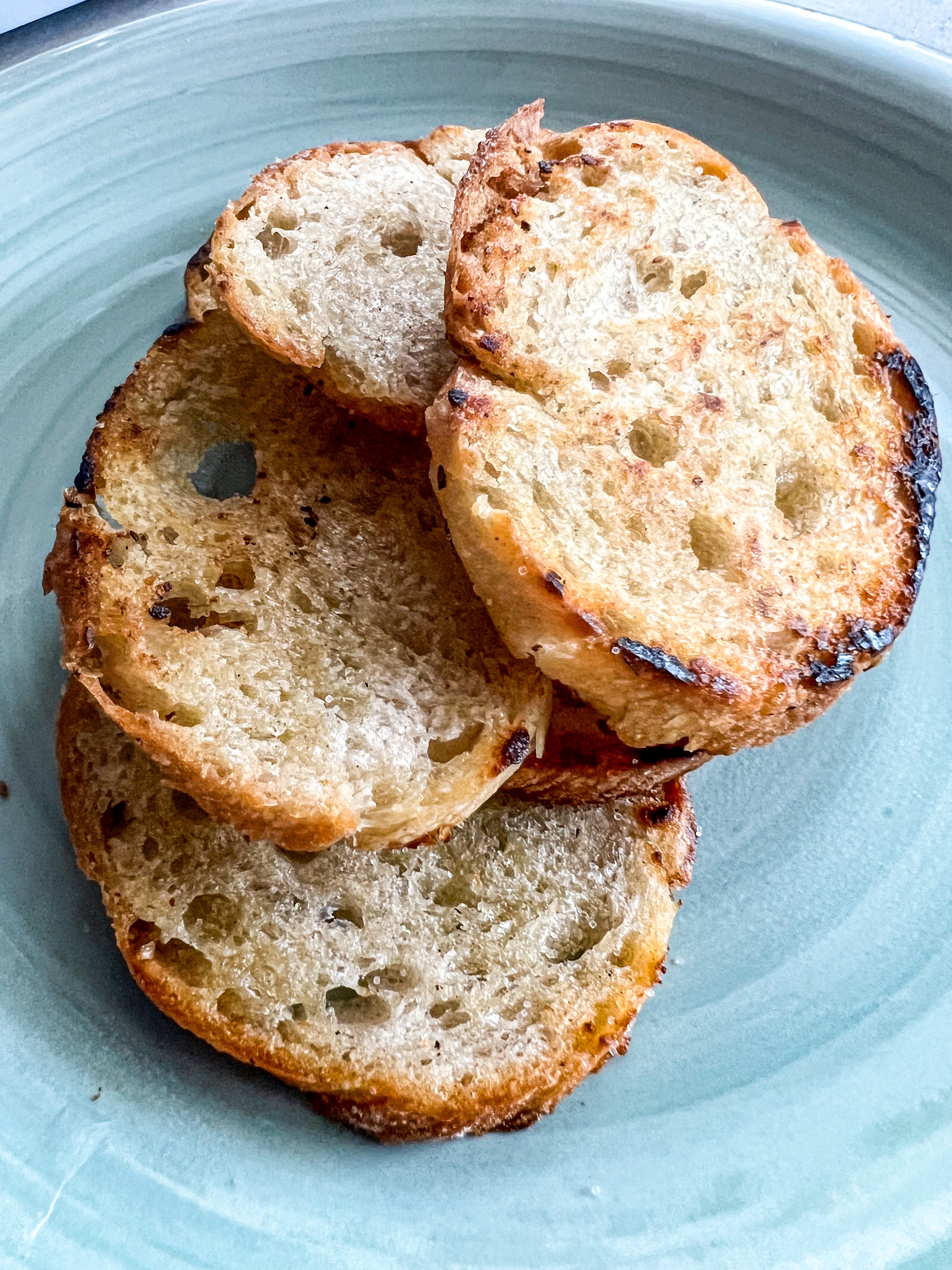 Skiva upp det. I stekpannan med det och sen ringlar du god olivolja över. Låt rosta på medelvärme, håll koll bara så du inte bränner det. Strö på lite flingsalt sen är det klart.