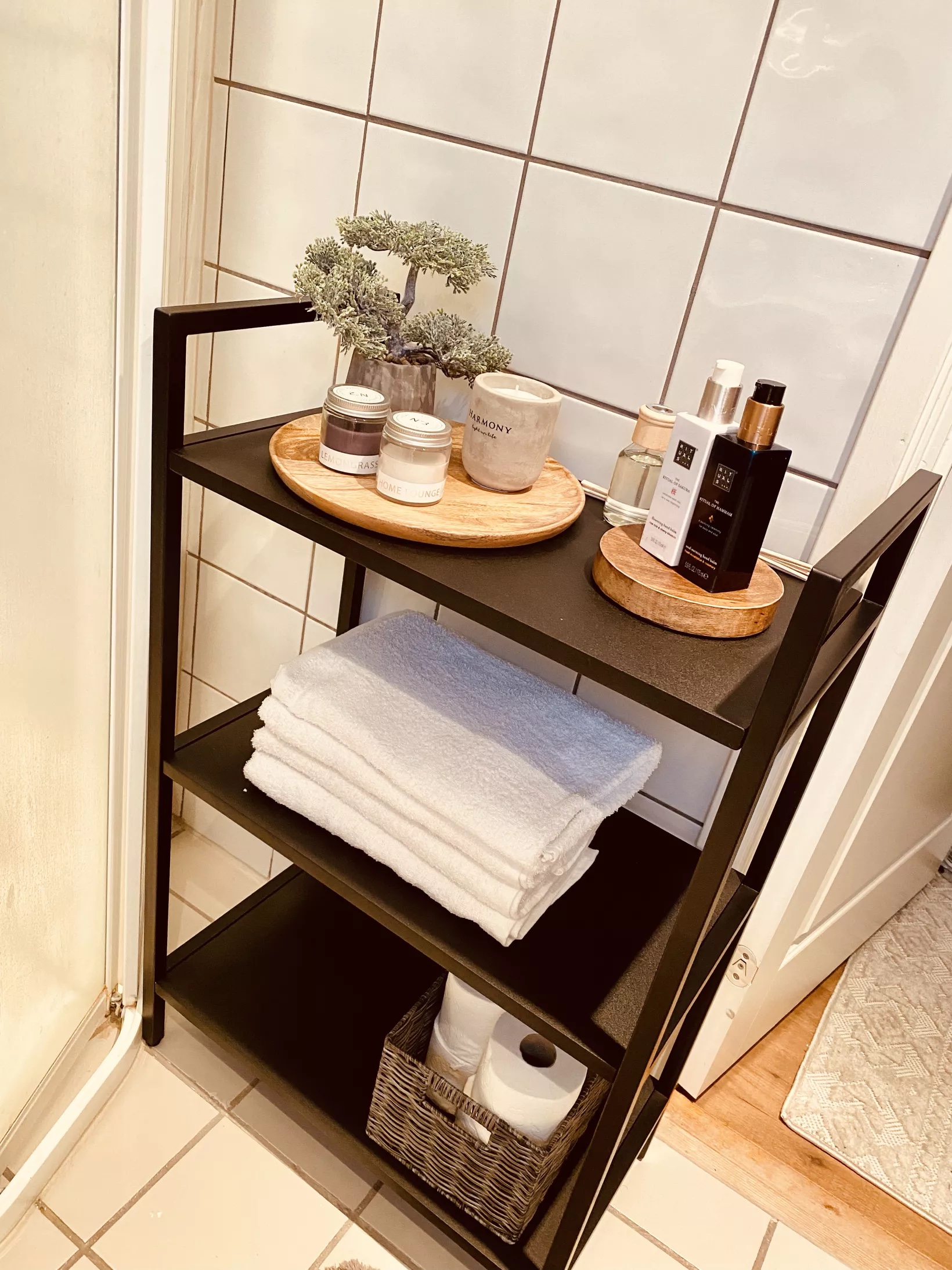 Enkelt fixat med en hylla, tror jag köpte den på Jysk. Man kan ställa in lite handdukar, toapapper och skönhetsprodukter kanske.