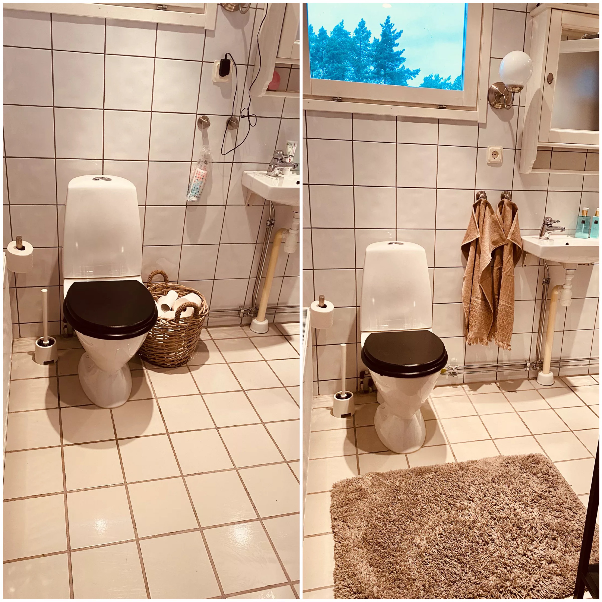 Den här toaletten är ju såååå trist (det är här det ska bli nytt handfat och badrumsskåp), men med en matta och lite handdukar så blir det ju i alla fall lite mysigare.