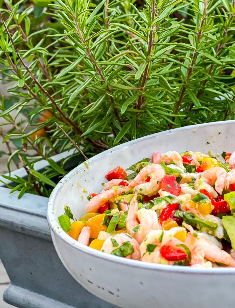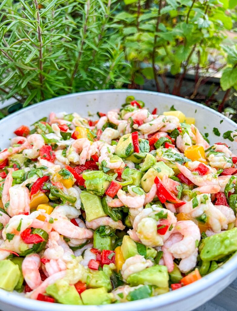 - Hacka spetsparika, skala och hacka mango om du använder färsk, hacka salladslöken. Lägg i en tallrik. Häll i räkorna. Blanda.