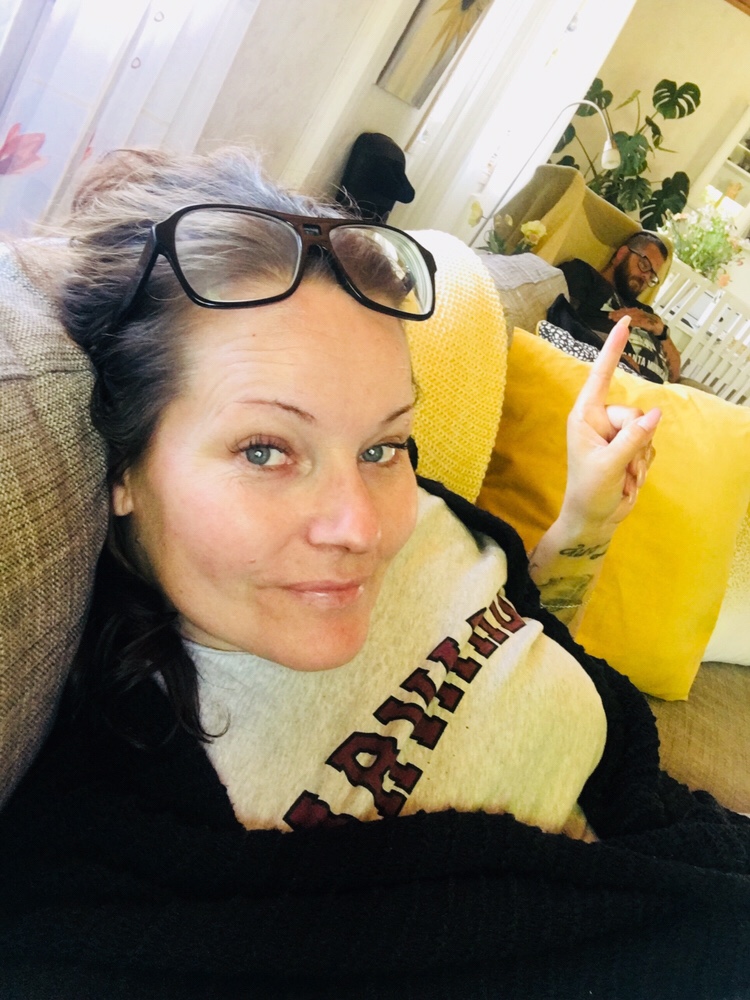 Här är jag, lite trött i håret efter tjejfesten igår. Jädrans så roligt vi hade. Kattis hade fixat så himla gott och fint. Det blir alltid så bra hemma hos henne! ❤