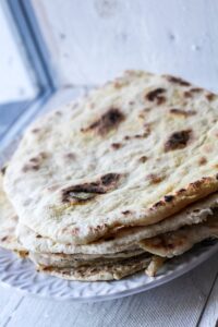 3) Med mjölade händer delar du degen till 8 delar. Kavla ut varje del runt och tunt. Ha mjölad kavel och mjölat bakbord så inte degen fastnar.