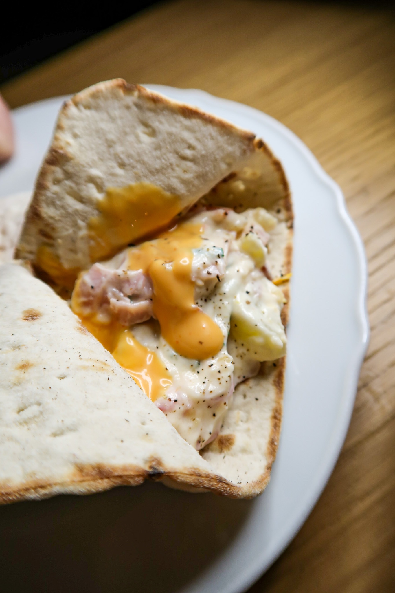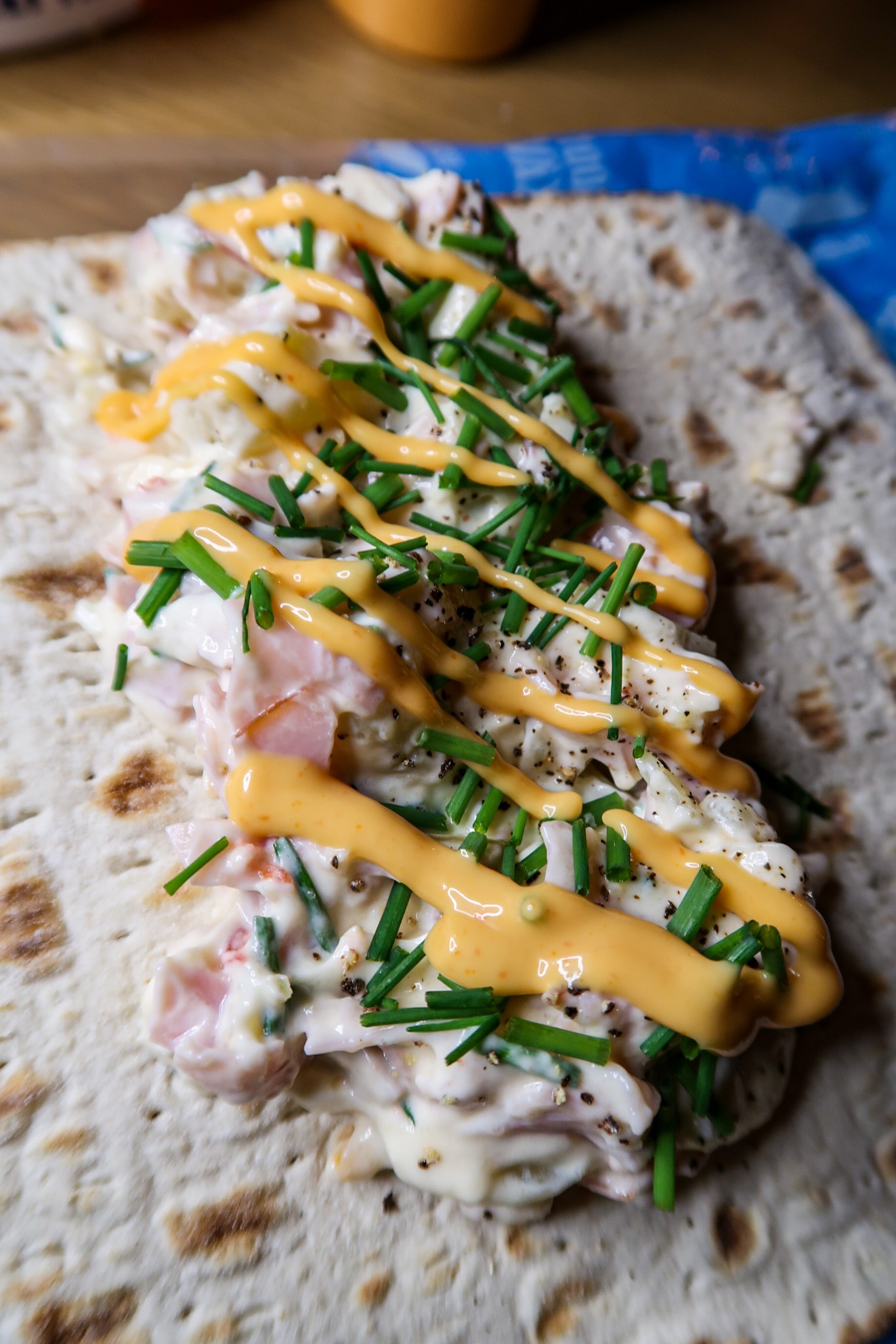 3. Klicka på röran på 3 tunnbröd. Toppa med srirachamajjo och klippt gräslök. Vik ihop brödet och servera.