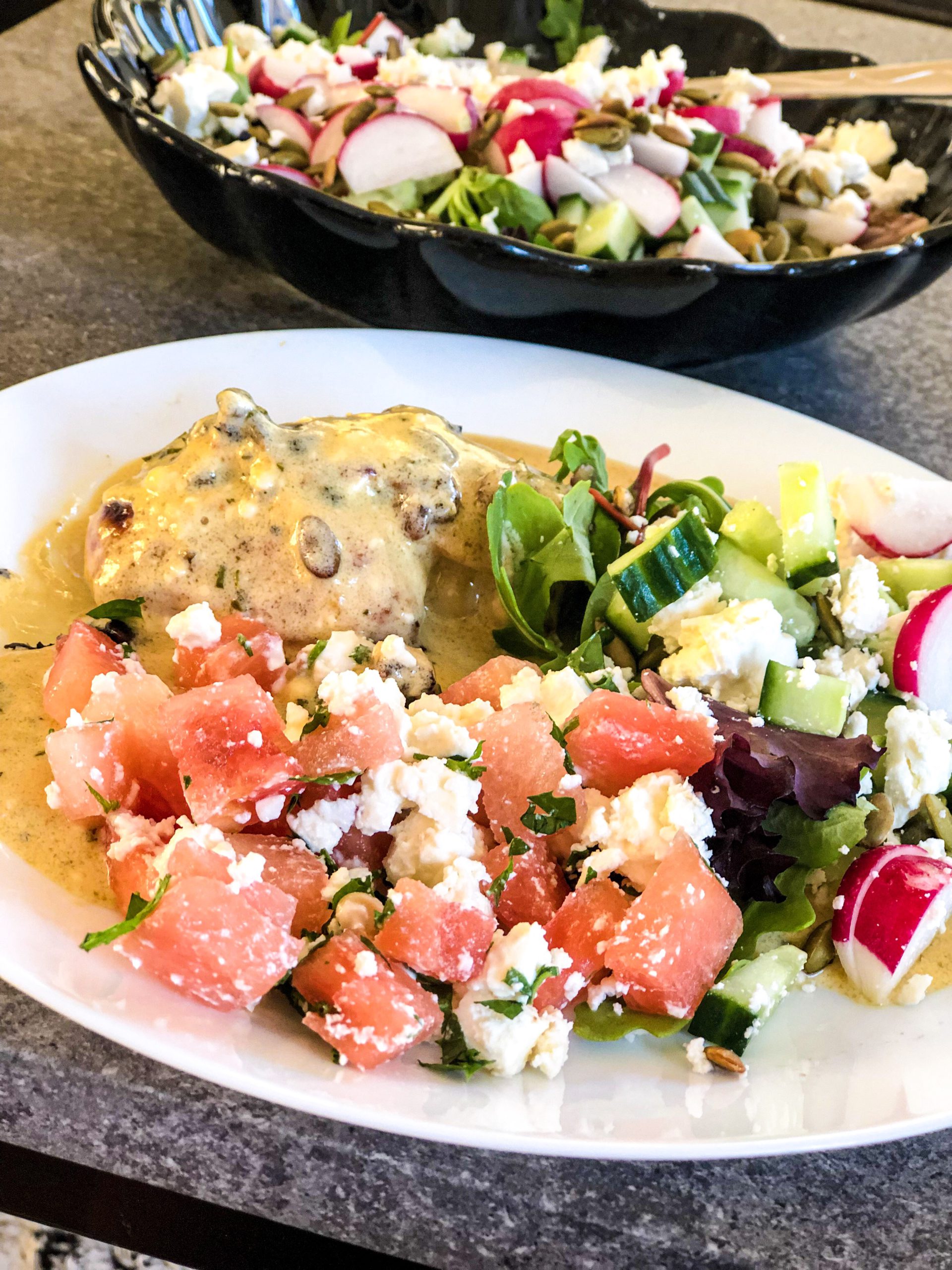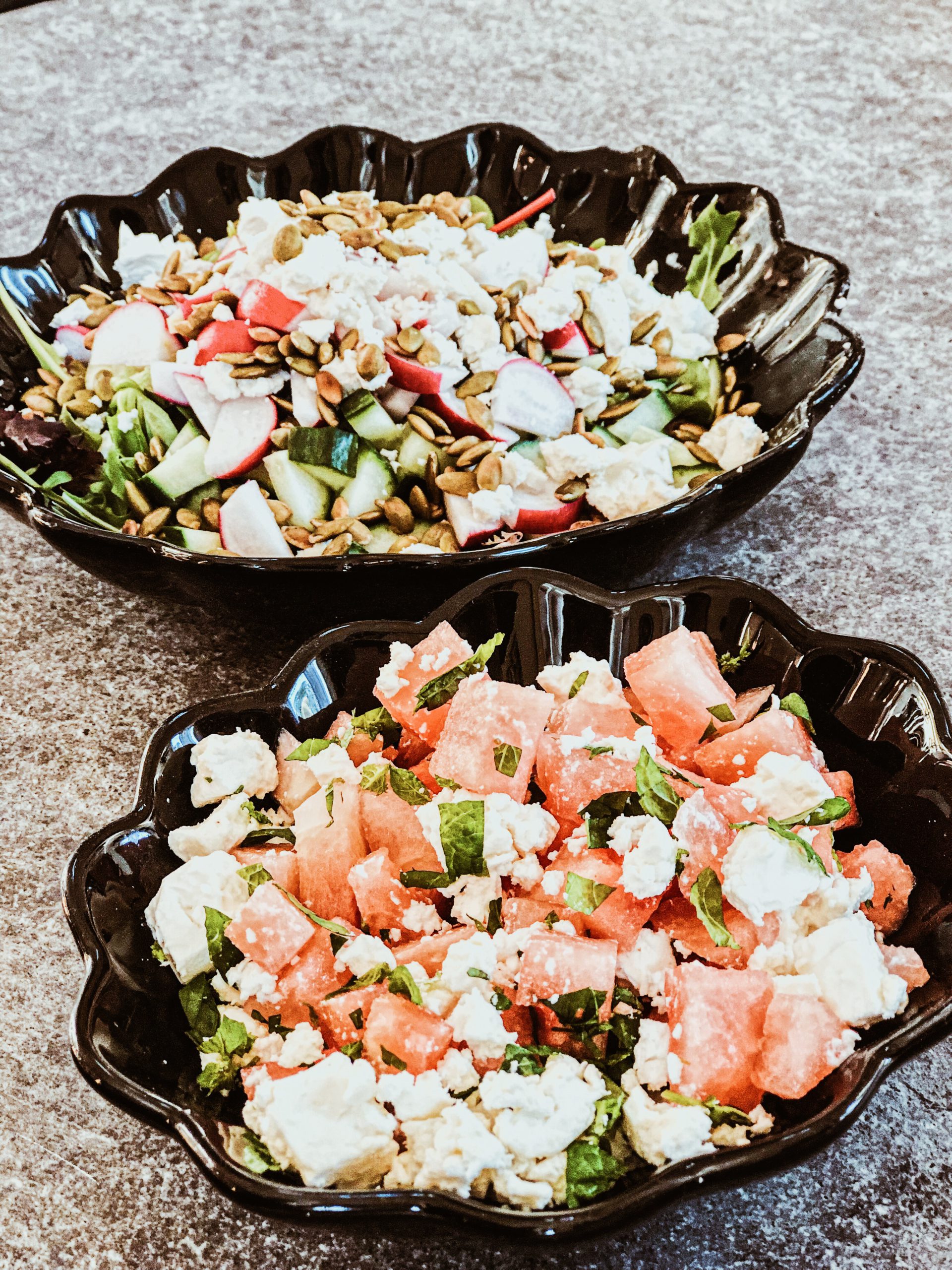 Vattenmelon (kärnfri), fetaost, hackad mynta.