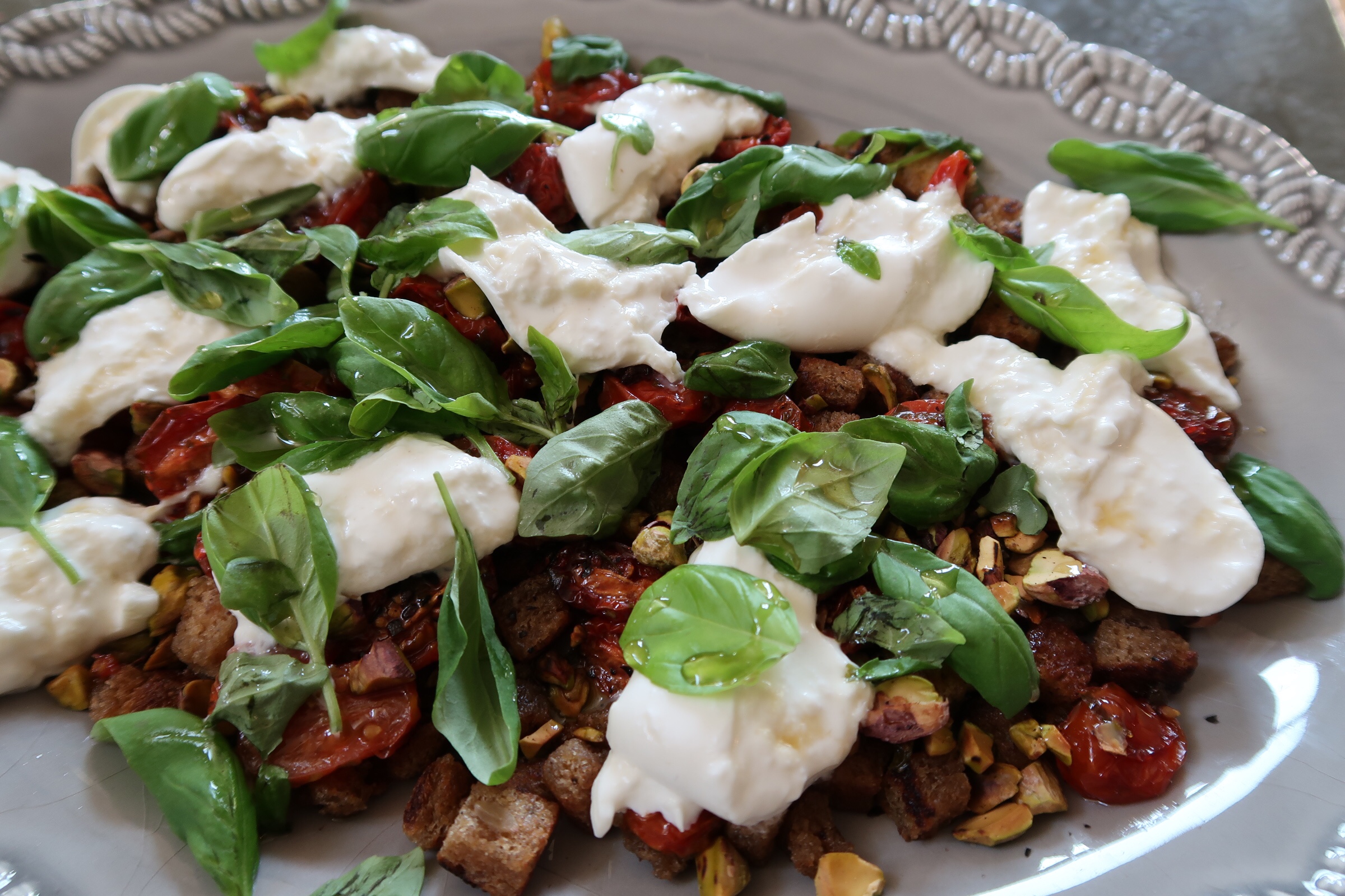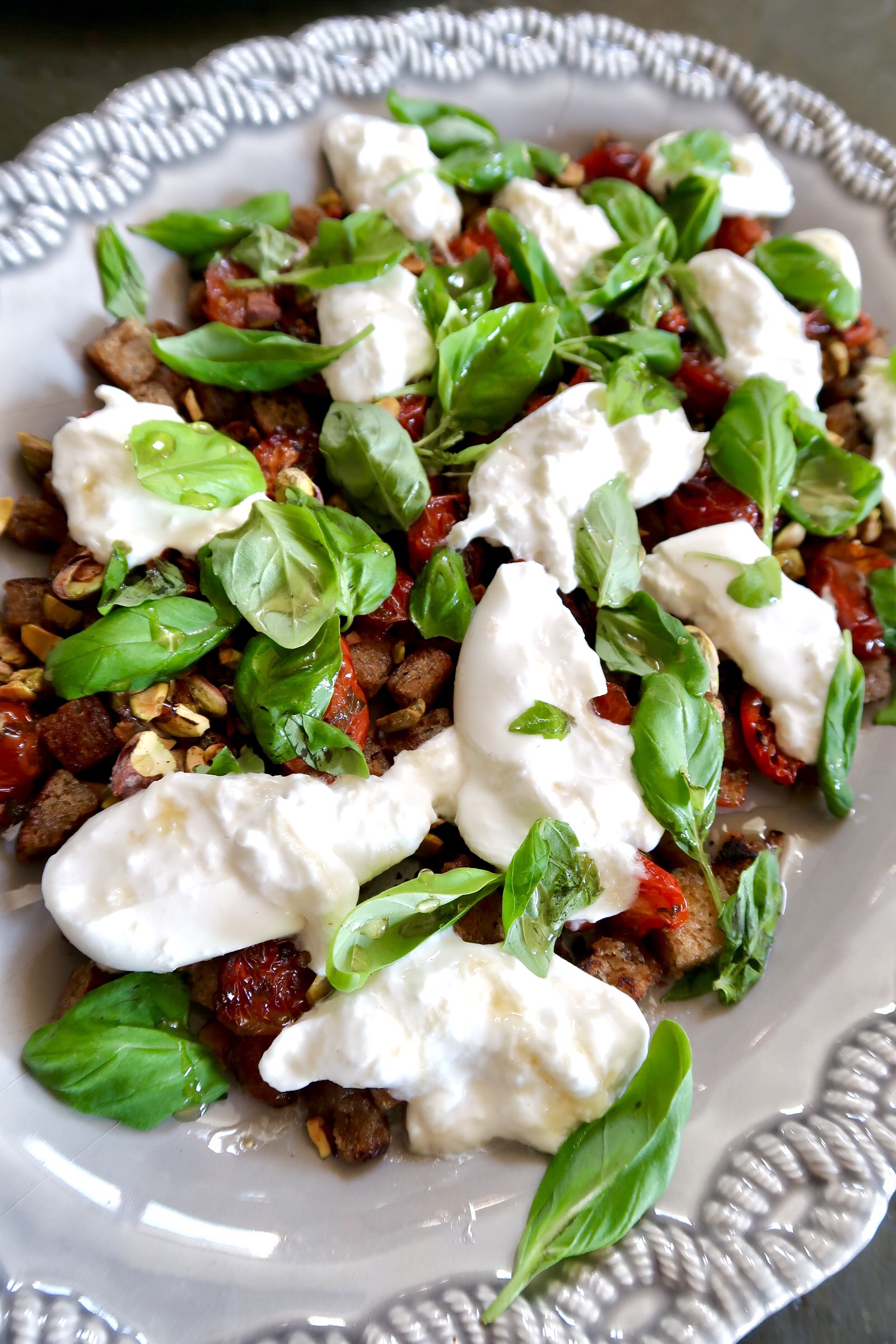 4) Lägg brödet i botten. Strö över pistagenötterna, ha på tomaterna, skär Burratan i mindre bitar och ha på det också. Ringla över honung och toppa med färsk basilika. Servera!