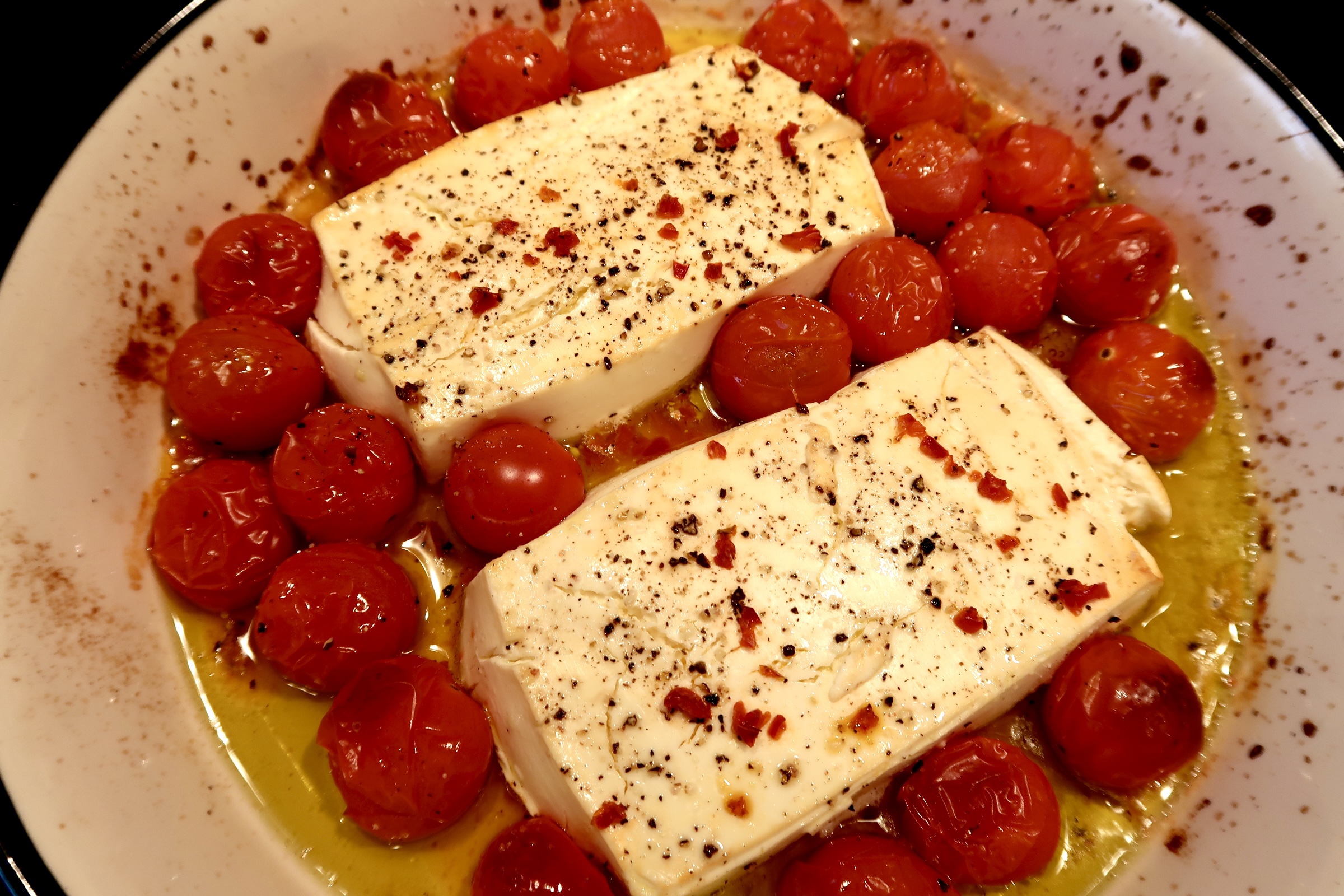 2) Lägg i alla cocktailtomater, hacka chilin och strö på den på fetaosten. Salta och dra några varv med pepparkvarnen. Koka pastan.