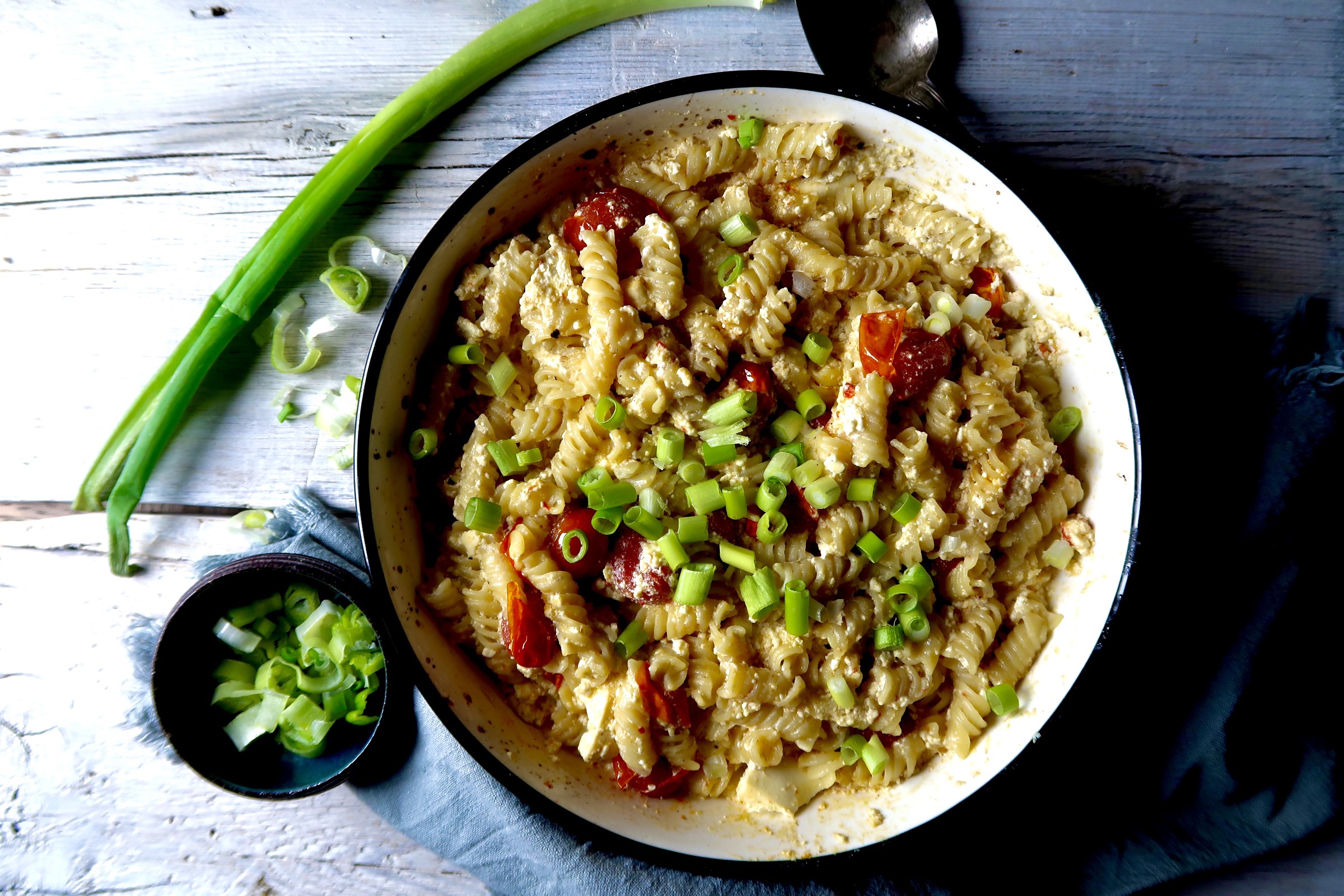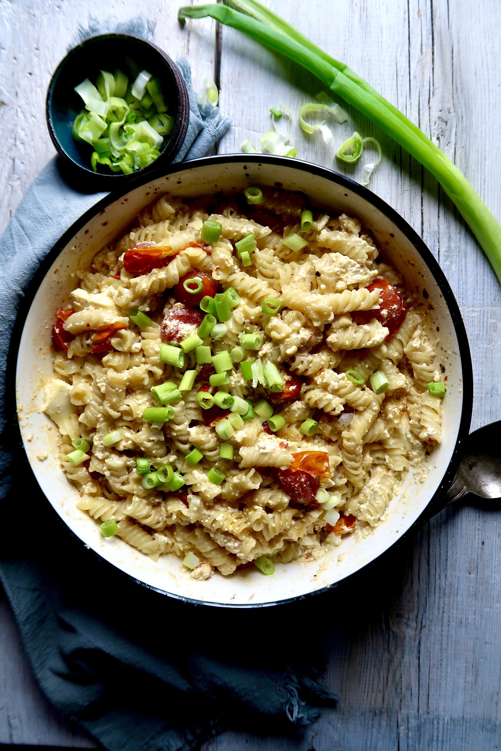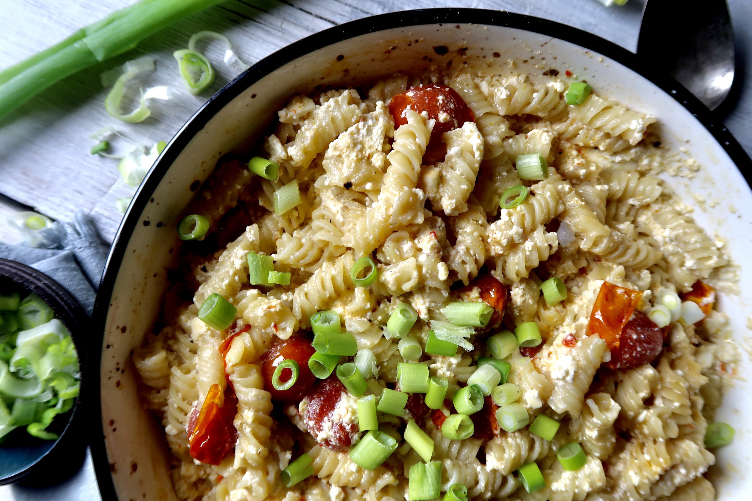 4) Ta ut ur ugnen, ta en gaffel och dra sönder fetaosten. Häll i den nykokta pastan och blanda runt. Servera genast! Jag strödde på lite salladslök, funkar fint med färsk basilika också.
