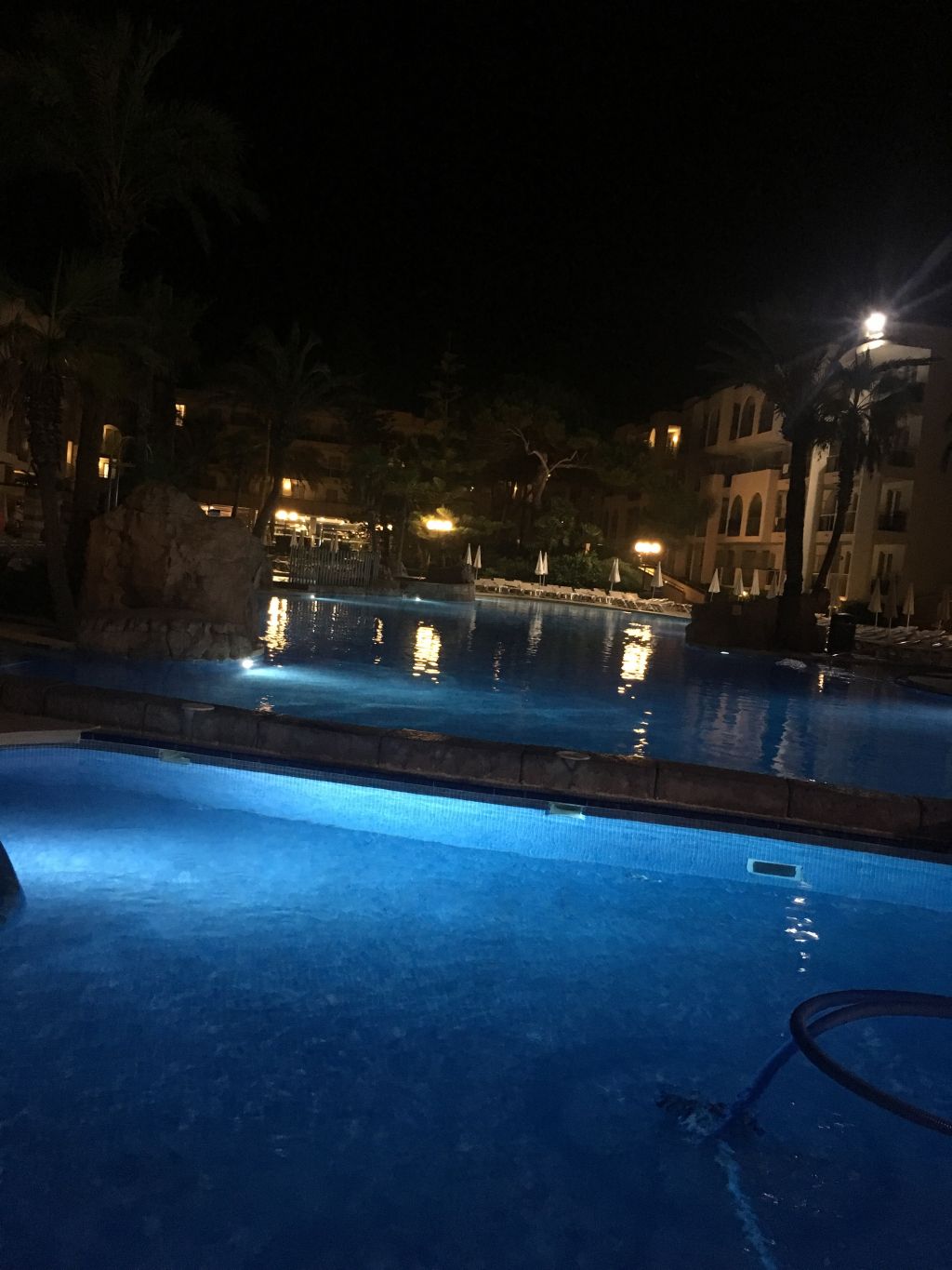 Jag vaknade kl 3 inatt. Mamma vaknade 2. Vid kl 5 skickade hon att det fanns the att dricka i deras rum. Jag tassade upp dit. Milo kom också efter en stund. Efter det tog vi en liten promenad vid poolen. Snacka om att det är mörkt alltså! Kolsvart fram till 07.30.