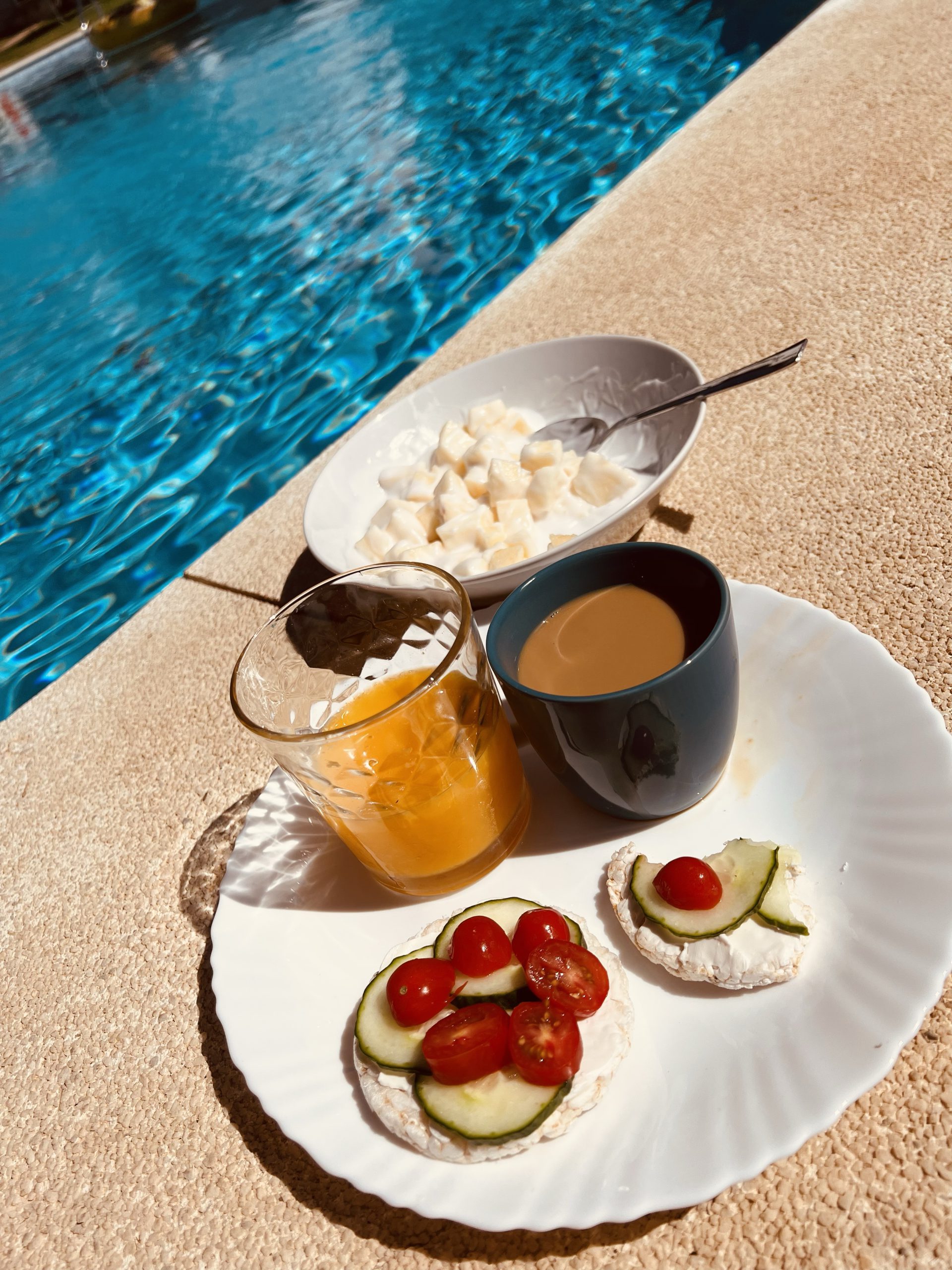 Sedan har vi antingen ätit frukosten på padelbanan eller så kommer vi hem och njuter av frukost vid poolen. Här kan jag sitta och jobba samtidigt och bara njuta. Känns nästan olagligt ibland, får man ha det såhär bra? Lite typiskt mig och min historia med svår hypokondri och ångest, det har ju känts fel att må bra för mig, som att jag snart ska bli straffad av något för att jag mår bra. Som att det inte är ett normaltillstånd. Skitsvårt att förklara och bara något som någon som erfarit samma sak förstår.
