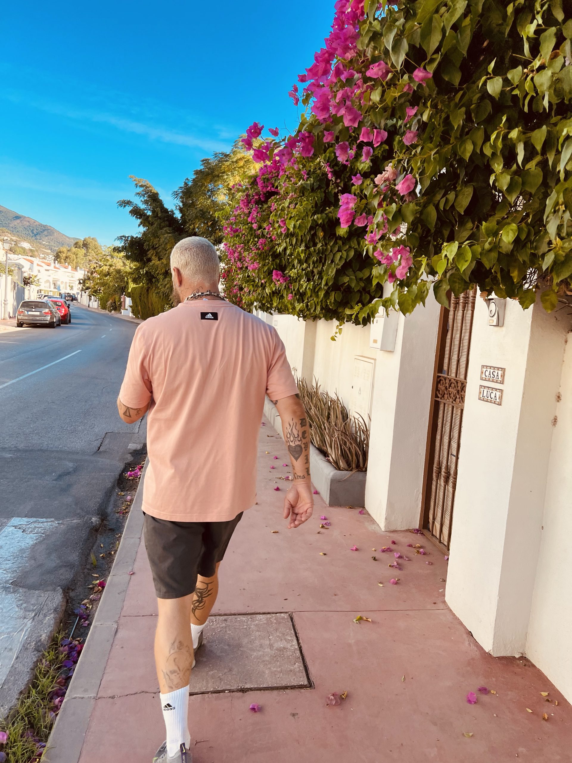 På väg till padelbanan när vi just kommit ut från vårt hus möts vi av detta. Älskar dessa magiska trädet som påminner om granar.