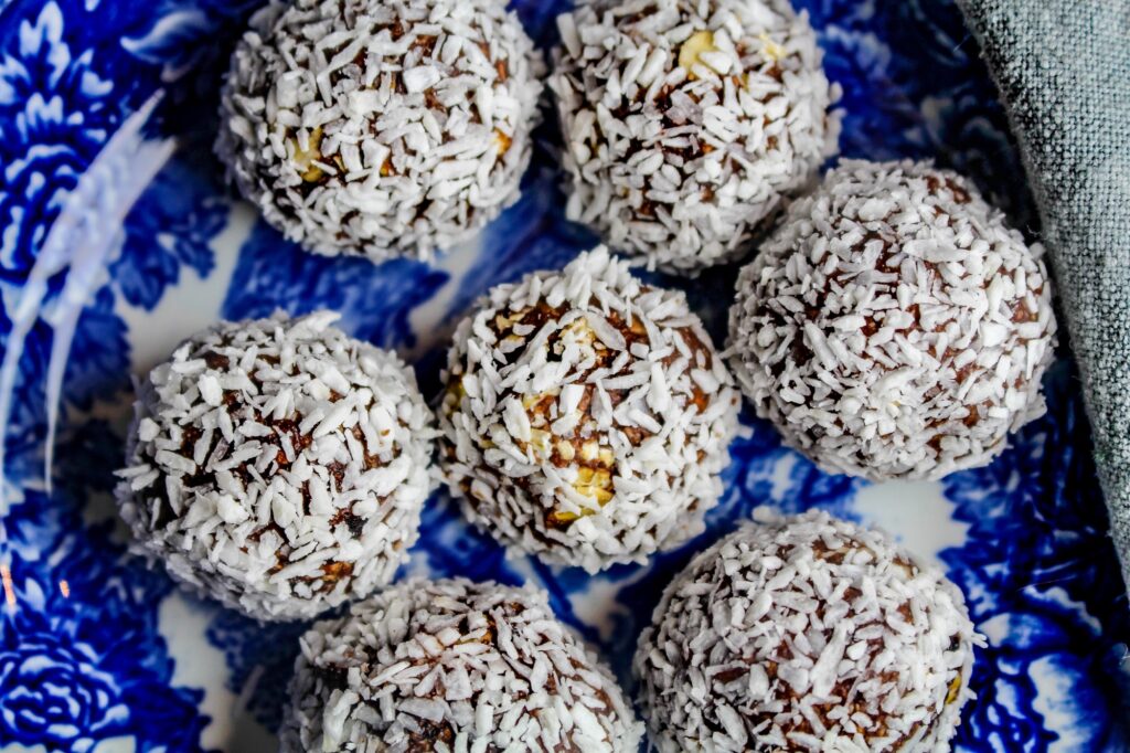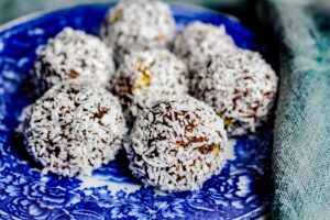 3) Rulla dem i kokosflingor (eller i tipsen jag angav högre upp i inlägget). Förvara i en tätslutande burk i kylen.