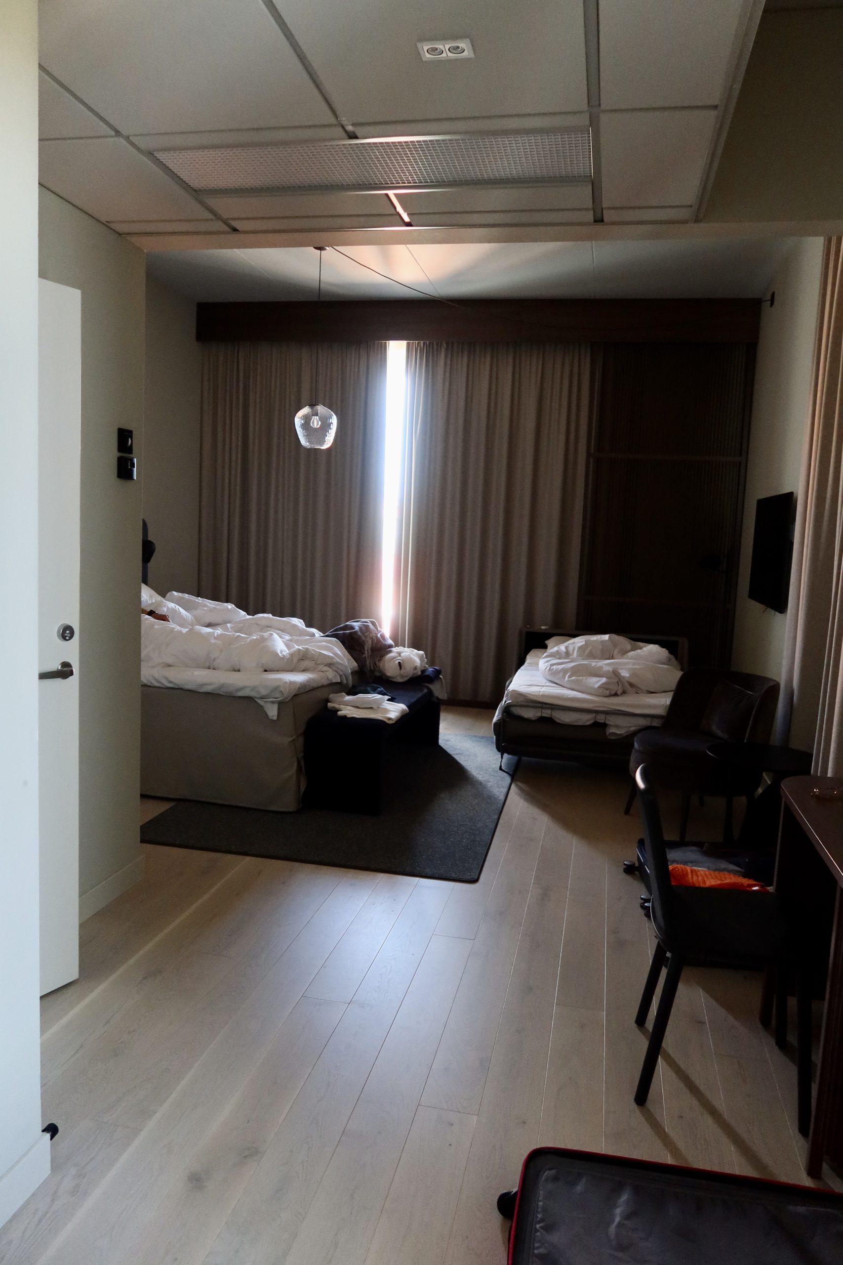 Jag körde men vi beslutade ändå att vi skulle bo kvar i närheten. Det var tur det, kl 02 åkte vi hem i natten. Hade aldrig orkat köra ända hem till Enköping. Jag som blir så sjukt trött av att sitta i bilen jämt. Här låg mitt lilla gäng och sov fortfarande. Frukosten skulle vara mellan 7-10 och denna bild är tagen 9.15. Det blev bråttom sen kan jag lova.