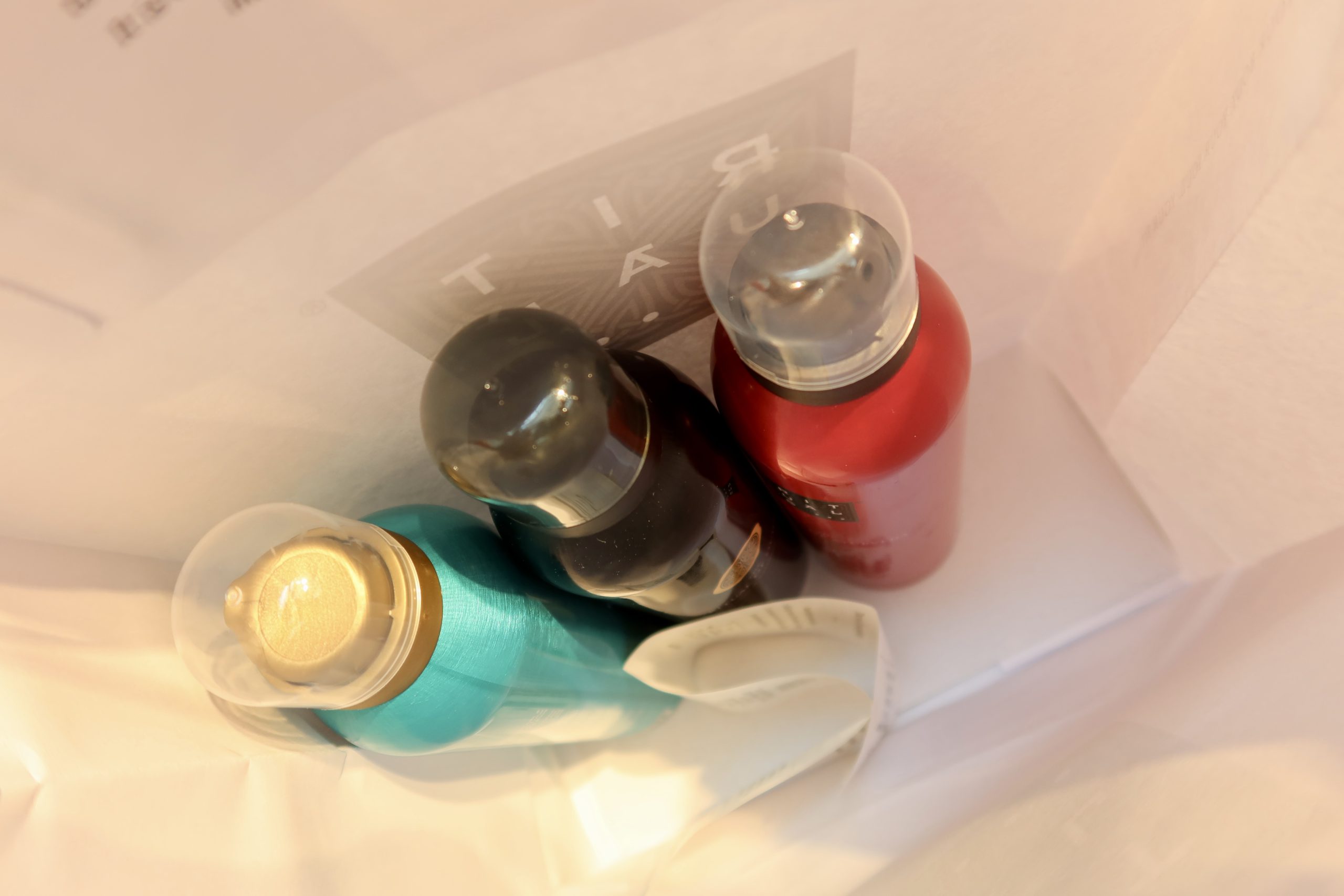 Den turkosa, ritual of Karma, doft av helig lotus och vitt te. Denna ger positivitet. Finns HÄR. Den svarta, ritual of oudh. Doft av patchouli och agarträ. Sägs öka välmående. Finns HÄR.