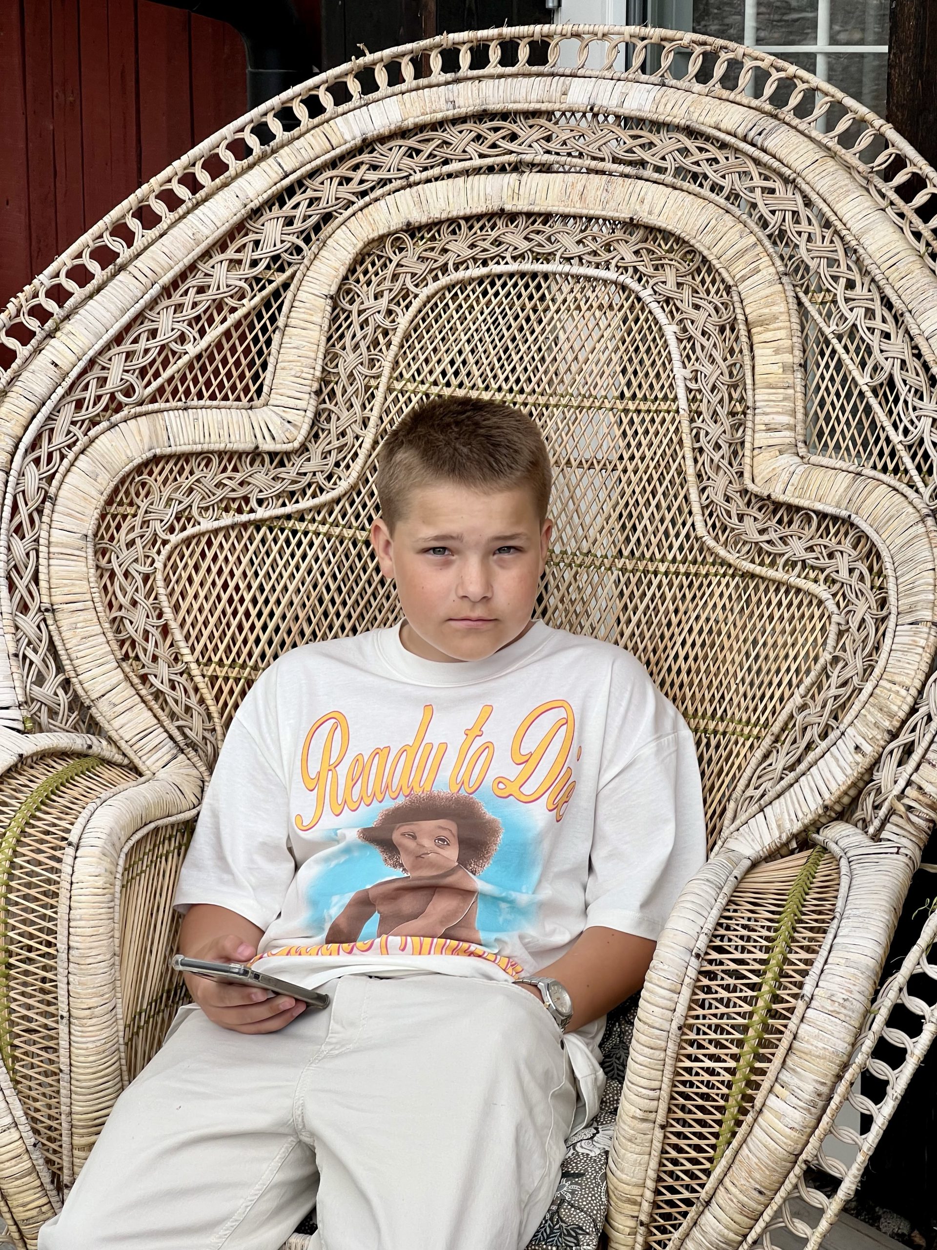 Först måste jag bara visa dessa superfina bilder på Milo. Tagna utanför Plain Vanilla när han satt i den här alldeles magiska rottingstolen.