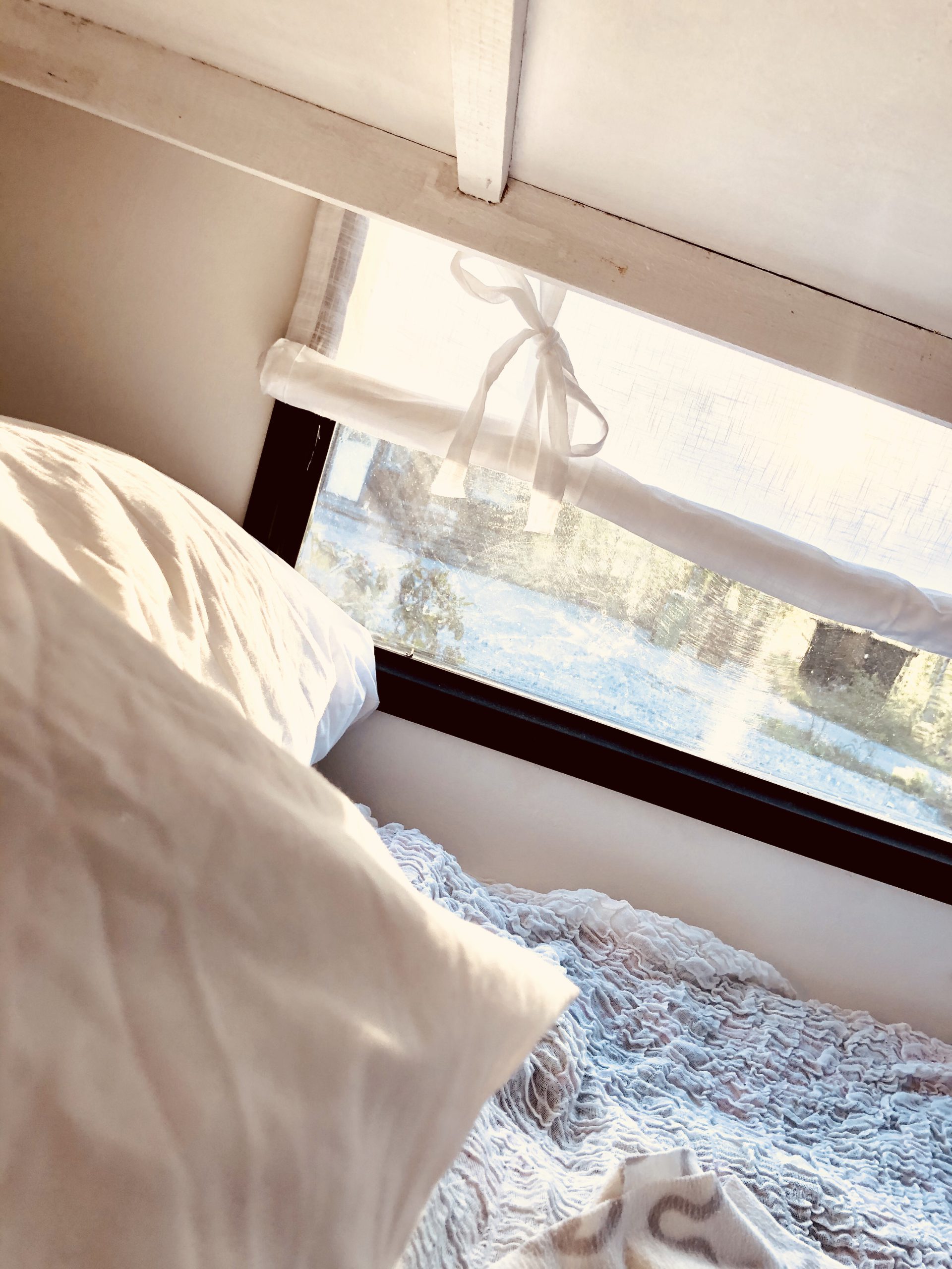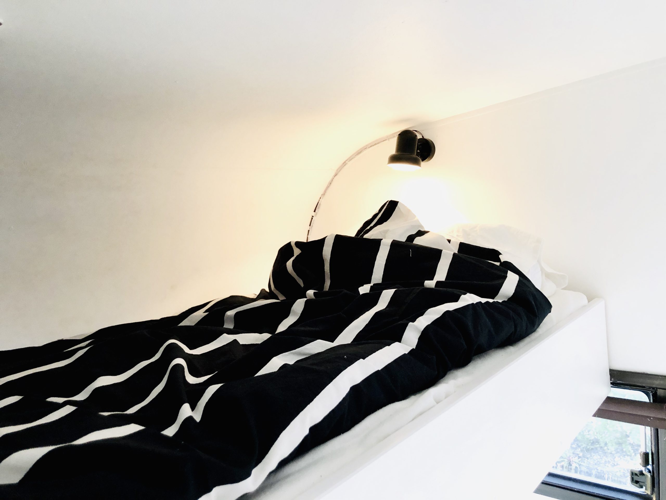 Sängen blev helt ljuvlig! Så skön att ligga i så den ser vi verkligen fram emot att få sova i inatt. Har också satt upp några hissgardiner för mysets skull, dom har ingen annan funktion.