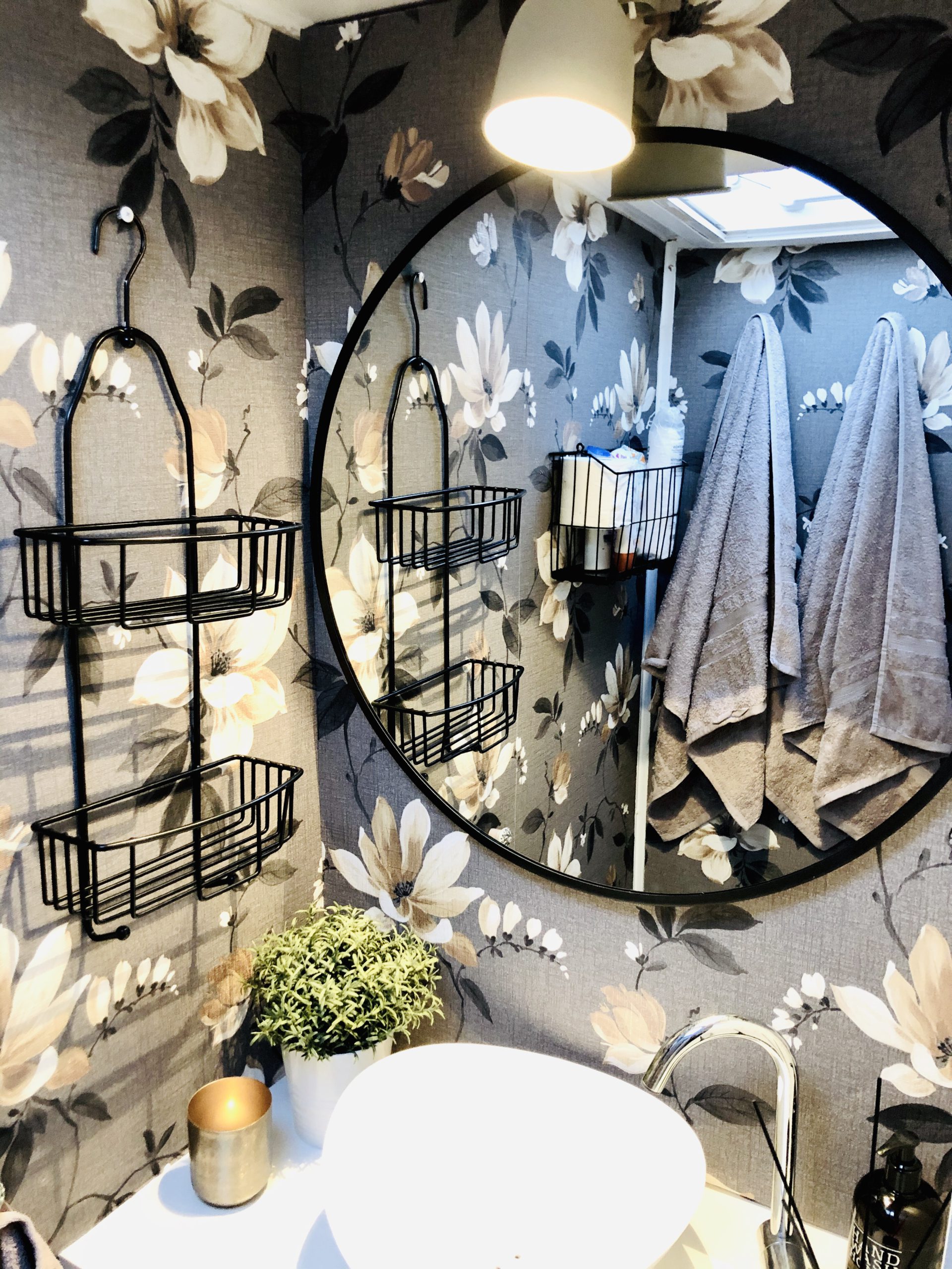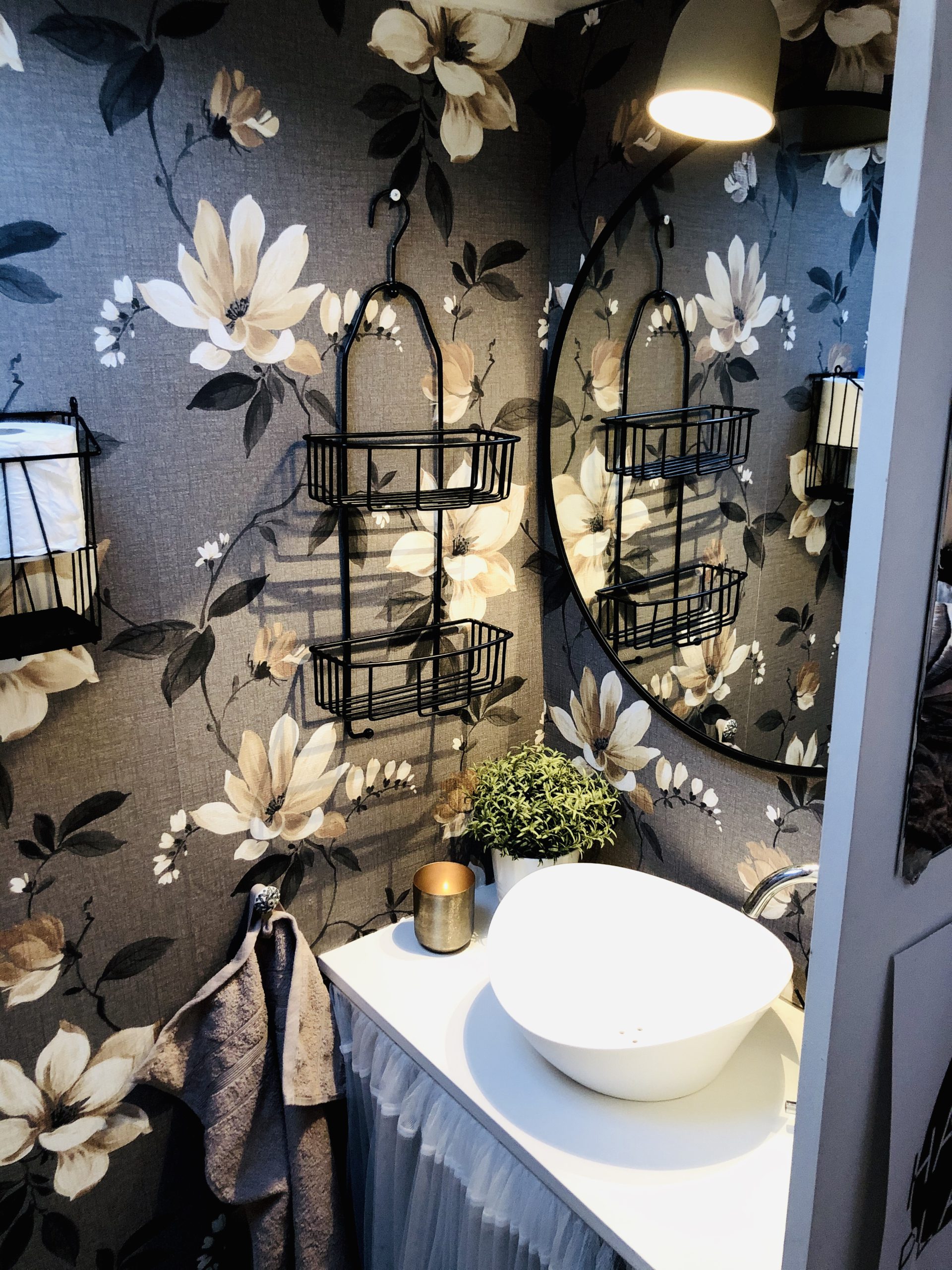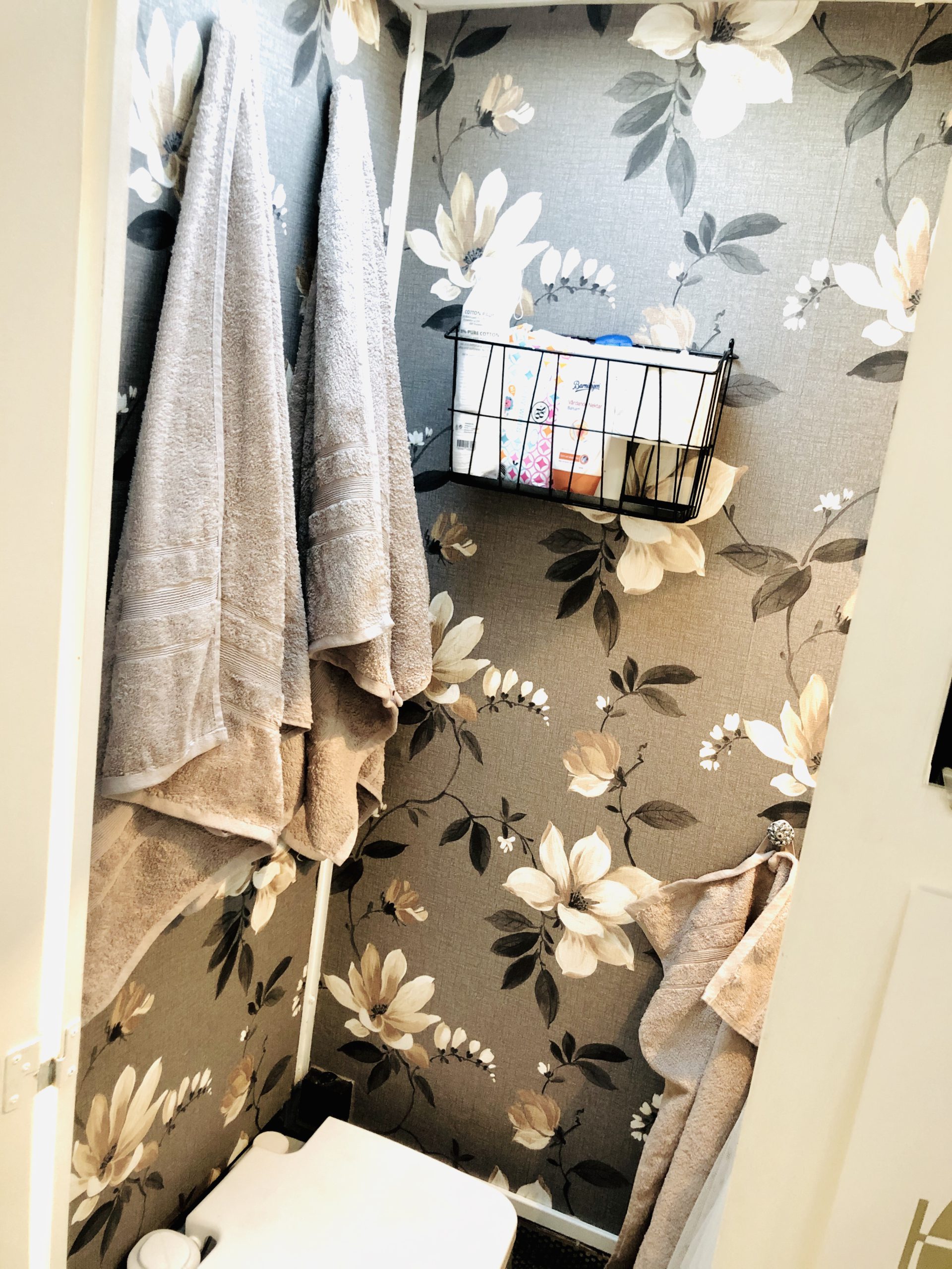 Här har vi den omgjorda toaletten. Nya tapeter, ny lampa och så köpte vi en supergosig matta. Vi har spraylackat lite hyllor som vi satt upp på väggen.