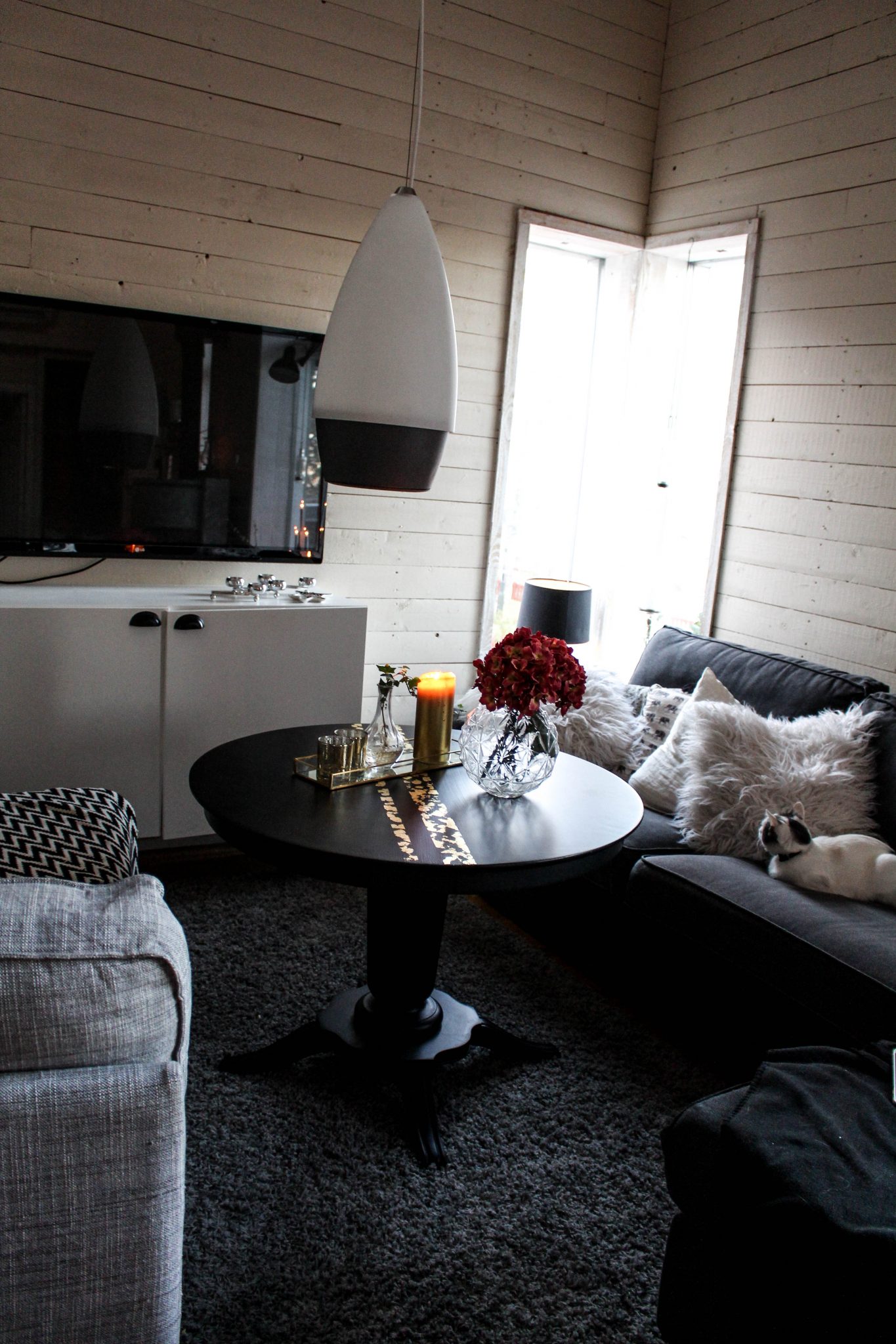 Lovade ju visa er vårt nya vardagsrumsbord. Det är ett gammalt pelarbord som går att snurra så den blir högre och lägre. Jag gillar att det är lite högre för då kan man sitta och äta vid TV:n också…. hehe. Ja, vi är specialister på att sitta och äta vid TV:n. Jag tycker det är så himla mysigt att göra det. Helst när man äter lunch ensam, då har man sällskap av någon.
