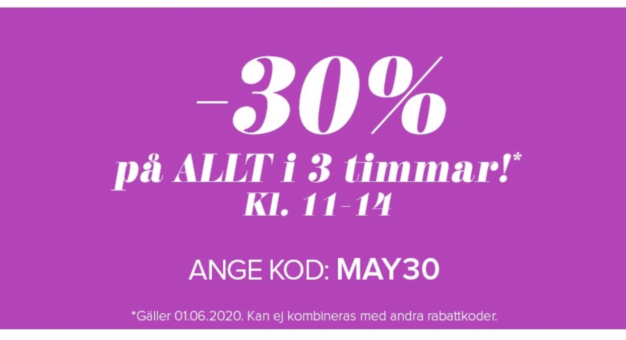 Idag, mellan kl 11-14 kommer du få 30% rabatt på allt om du anger koden MAY30.