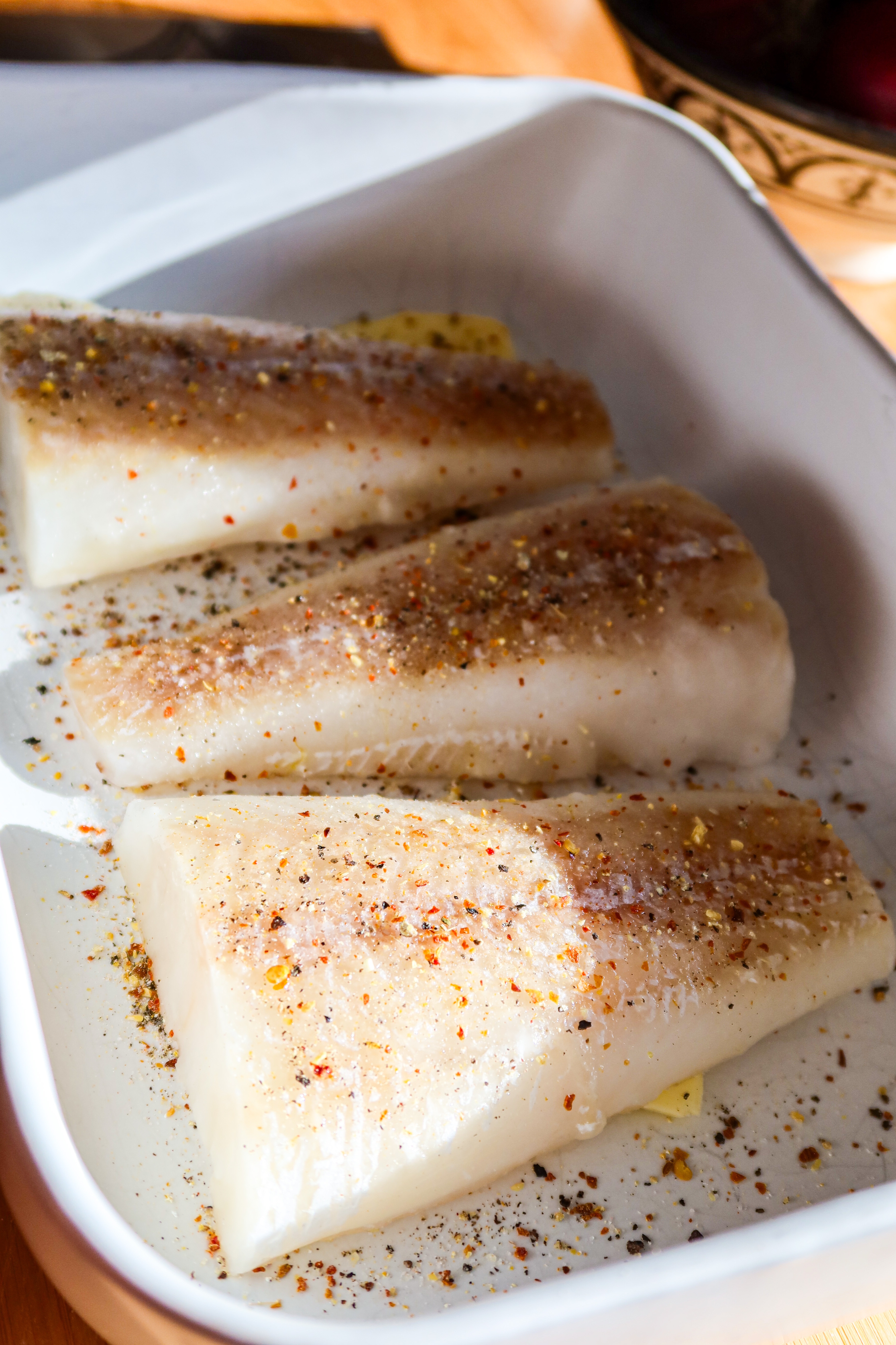 1) Hyvla skivor av smöret med en osthyvel, lägg tre skivor i en ugnsfast form. Lägg torskryggfileerna över varje smörbit. (Mina filéer var frysta). Krydda med salt, peppar och seafood & fish kryddan.