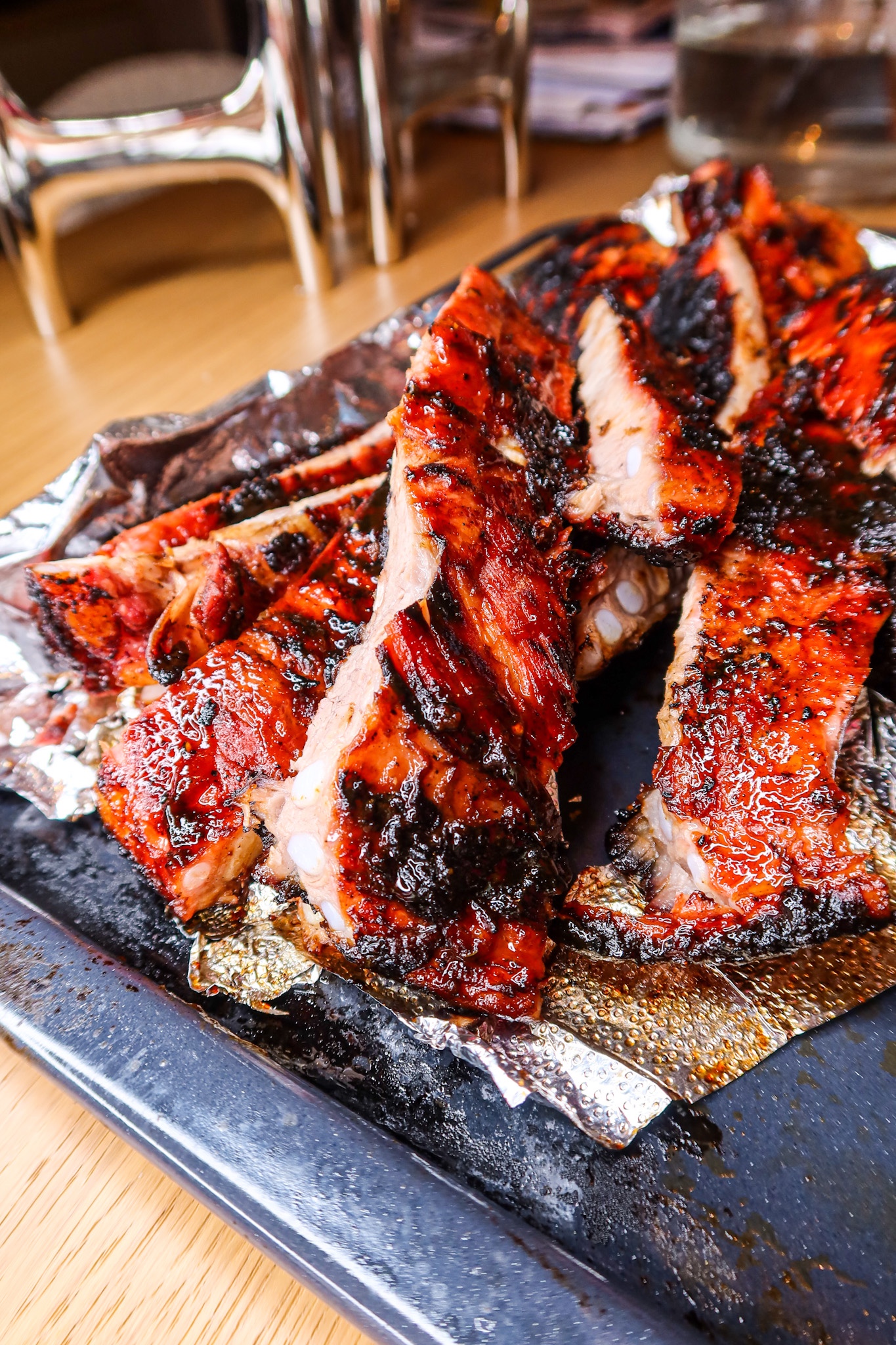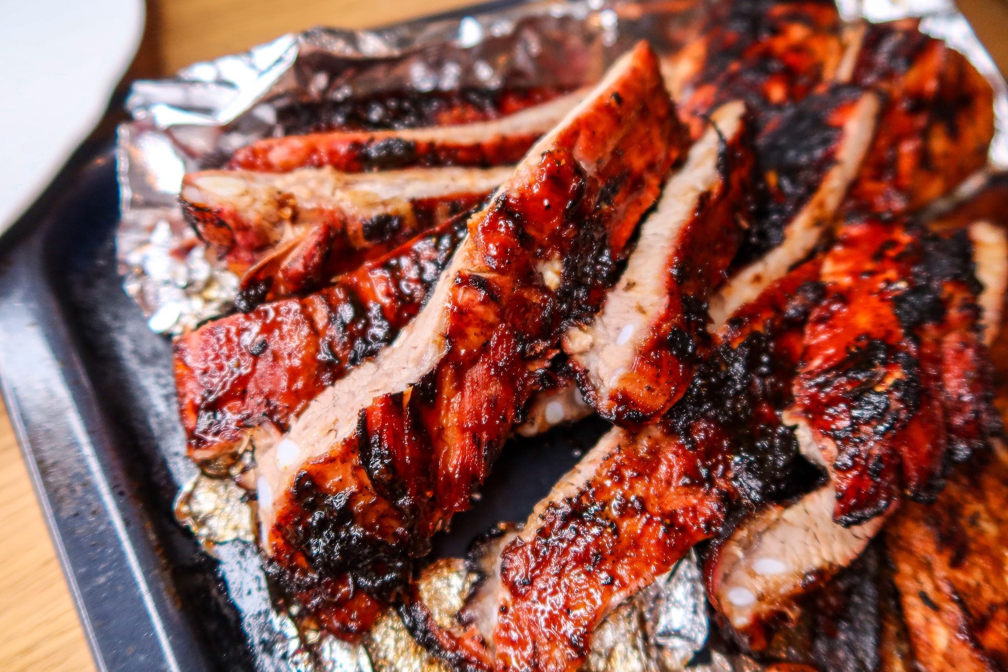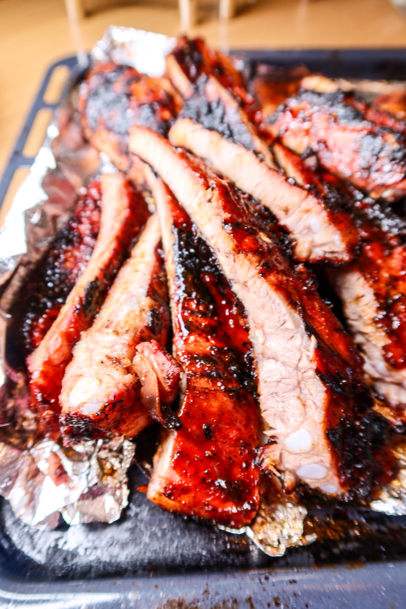Sätt igång grillen, ha kålen på ena sidan grillen. Köttet ska alltså inte ligga rakt på kolen utan bli indirekt grillad. Pensla in ribsen ordentligt med marinaden/glazen på båda sidor. Klä in ribsen med folie. Lägg på grillen (den ska hålla en värme på ca 140 grader). Lägg foliepaketet med ribsen på ena sidan av grillen, på med locket. Låt sedan grillen gå i 2 1/2 timma. Ta ut dem sedan och ta bort folien, pensla på mer glaze och lägg sedan på den på grillen men nu på direktvärme. Ribsen ska alltså bli sådär härligt karamelliserade och få riktigt fin färg.