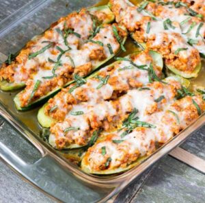 3) Fyll zucchiniskalen med röran och toppa med parmesan och mozzarella. Gratinera i ugn på 225 grader i ca 35 minuter, täck med folie innan gräddning. Servera med ris.
