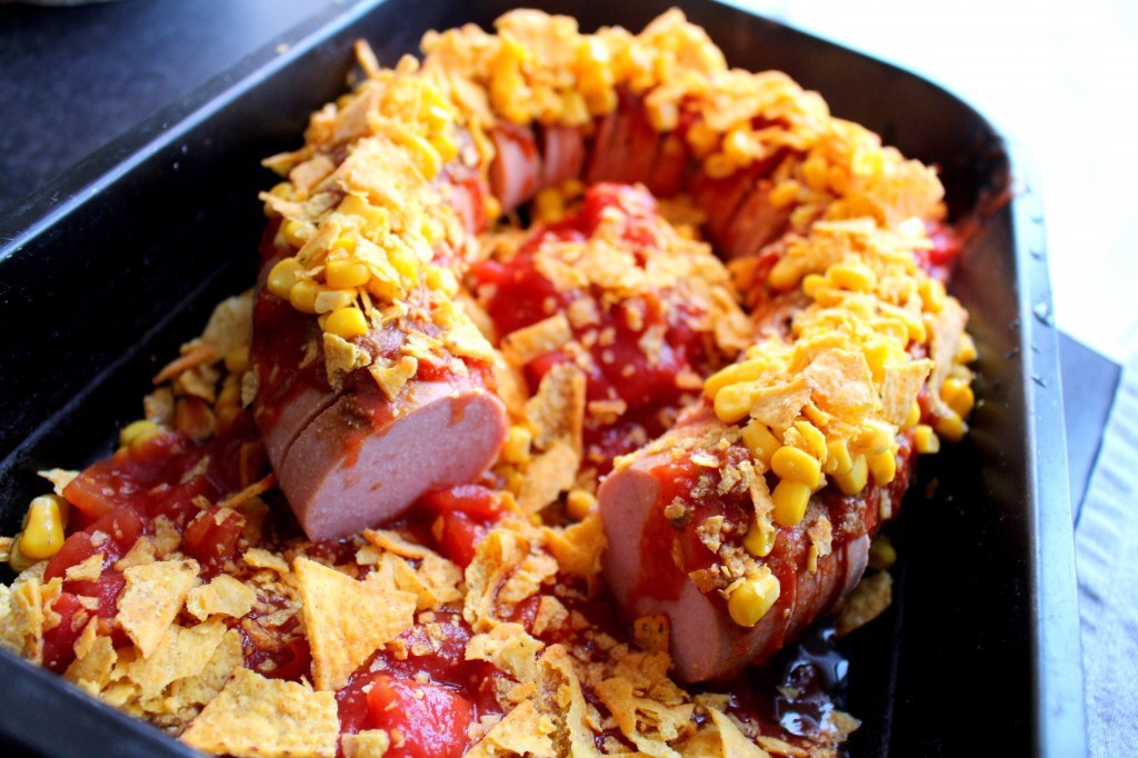 2) Krossa nachoschipsen. Häll över tacosås burken över korven. Krydda med spiskummin över korven. Strö på nachoschipsen över korven. Häll i de krossade tomaterna runt om korven. Strö även över lite krossade nachos över de krossade tomaterna.