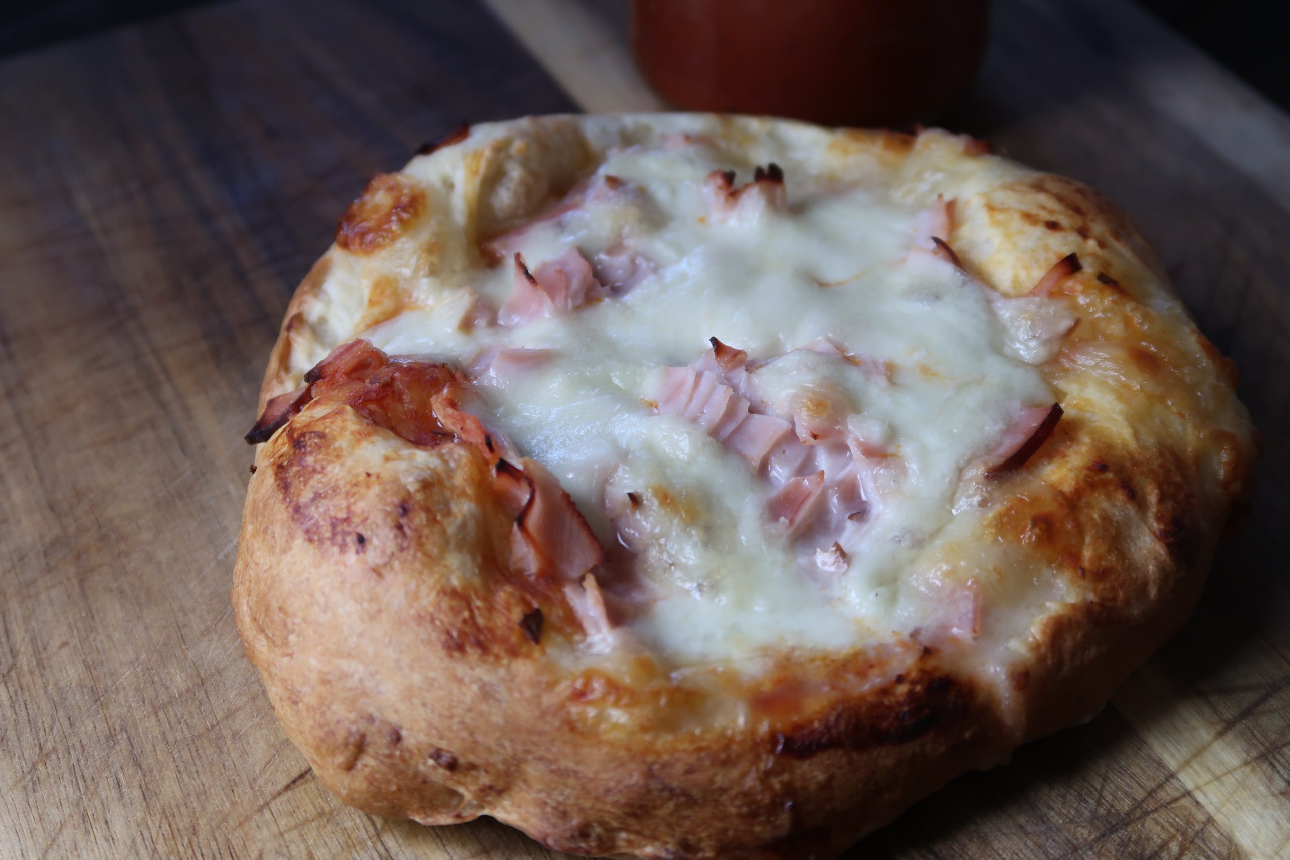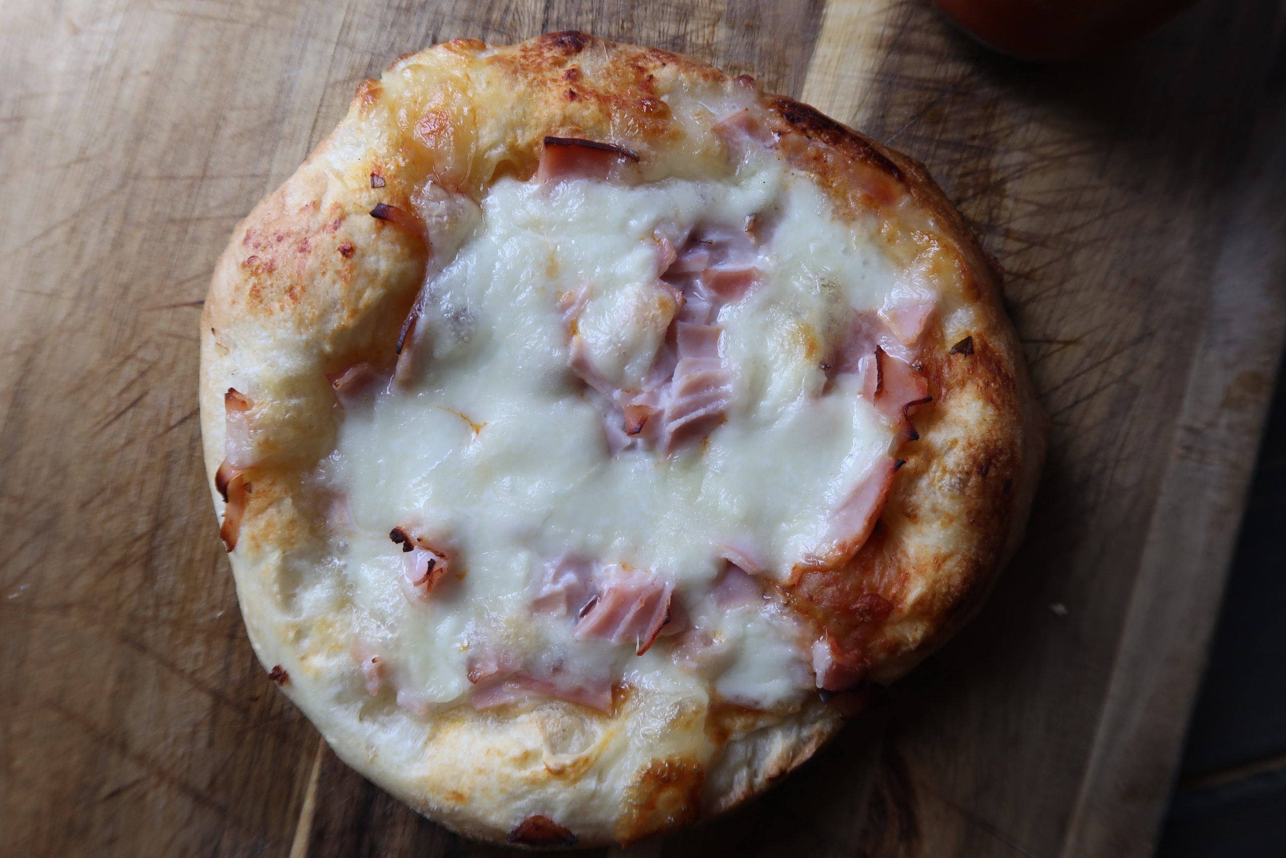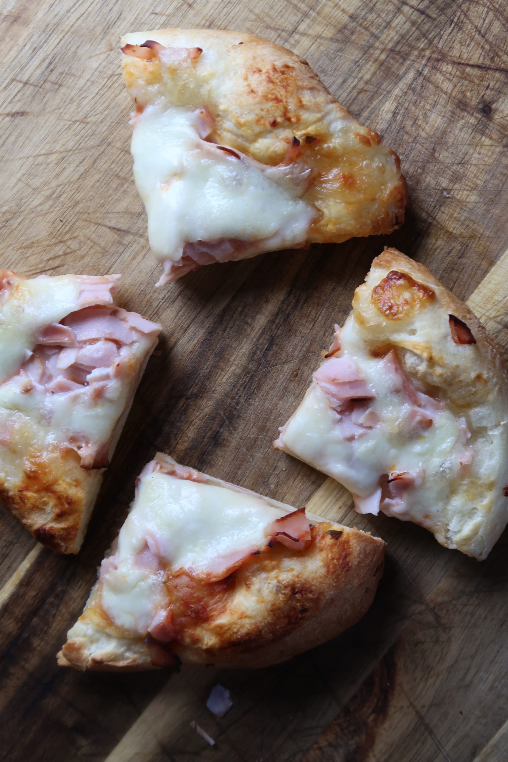 3) Ha på tomatsås, strimla skinkan och ha på den. Avsluta med hackad mozzarellaost.