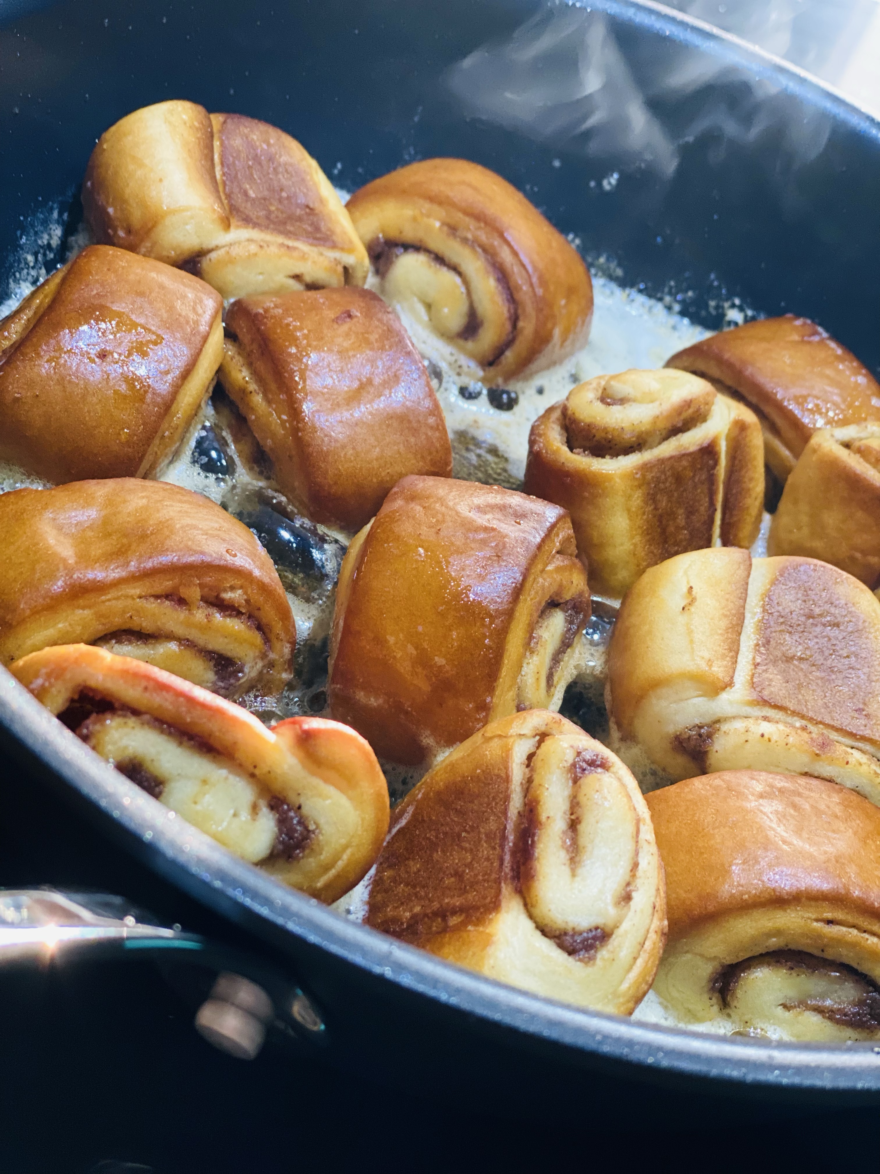3) Rör runt i stekpannan så gifflarna har smör på sig. Rulla dem i kanelsockret. Servera genast! Gaaaalet gott!