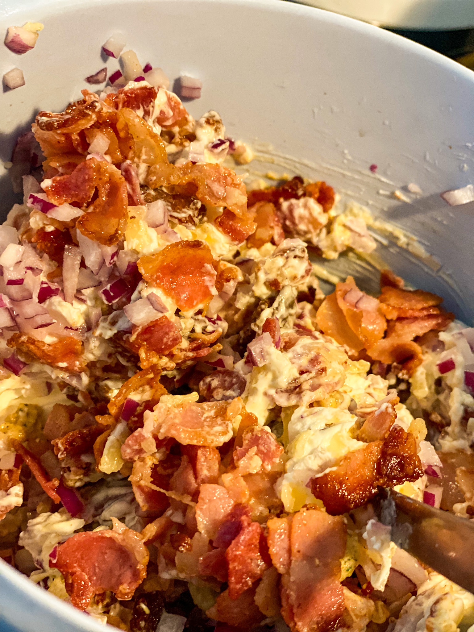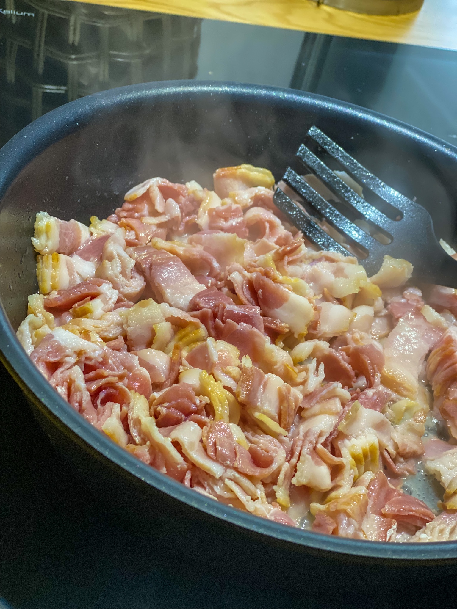 2) Strimla baconen, stek det tills det får lite färg. Häll av onödigt fett.
