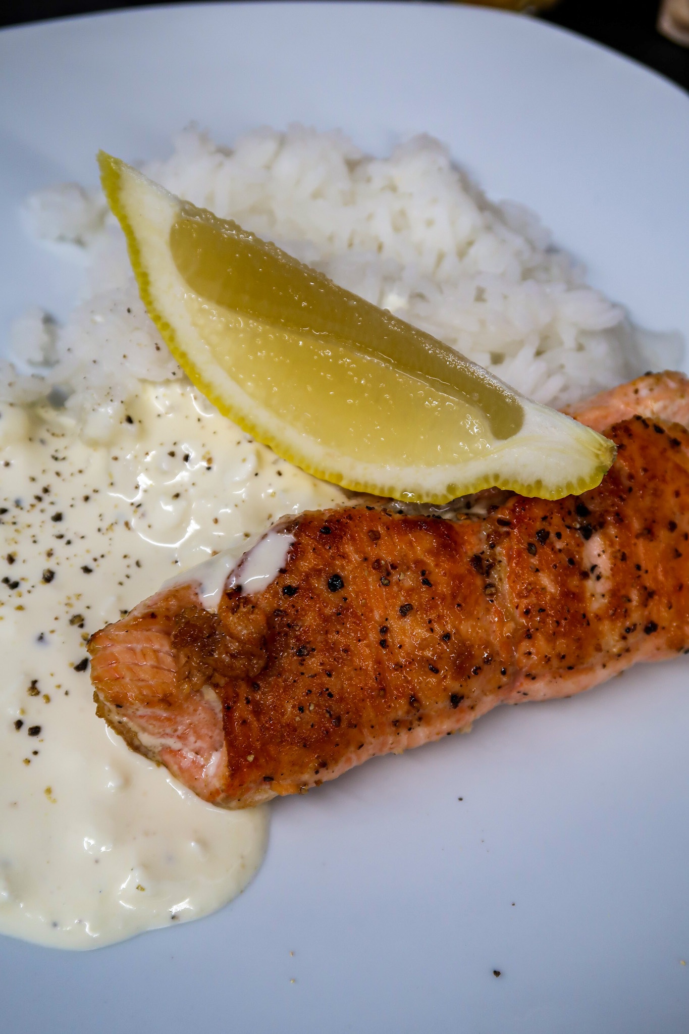 1. Salta och peppra laxfiléerna. Stek dem sedan i olivolja eller smör. Ha relativt hög värme och stek inte mer än ca 2,5-3 minuter på varje sida. Annars blir laxen torr.